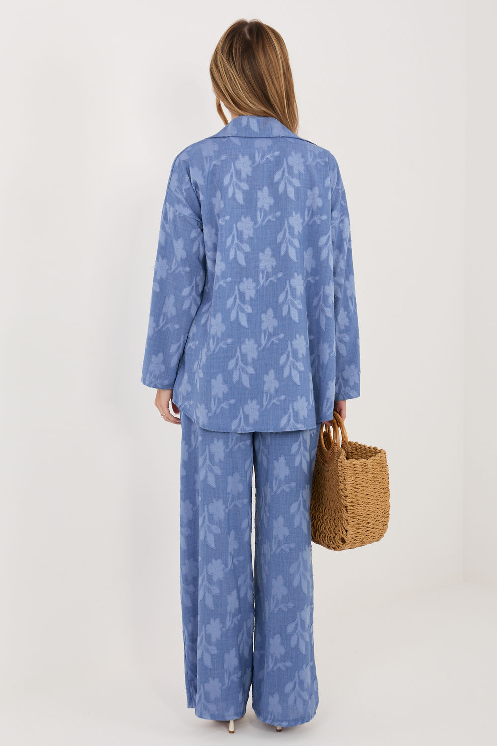 Damespak bestaande uit een blouse en broek is een stijlvol en comfortabel voorstel voor elke dag. Het onderscheidt zich door de gevarieerde textuur van het materiaal, die het geheel een modern en origineel karakter geeft. De blouse met lange mouwen, klassieke kraag en knoopsluiting ziet er elegant uit, maar tegelijkertijd casual, waardoor het zowel in casual als meer formele outfits goed tot zijn recht komt. De broek met lange pijpen is voorzien van een elastische tailleband met ingenaaid elastiek, wat zorgt voor een comfortabele pasvorm en draagcomfort gedurende de hele dag. Daarnaast hebben ze praktische, zijdelingse insteekzakken. Het pak is gemaakt van een zachte en aangenaam aanvoelende mix van viscose en elastaan, wat zorgt voor lichtheid, elasticiteit en bewegingsvrijheid. Het is de ideale keuze voor vrouwen die comfort waarderen in combinatie met een modieuze uitstraling.
