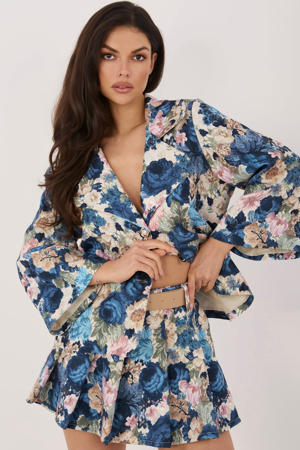 Elegante shortskirts met een subtiele bloemenprint, die perfect zijn voor zowel werkoutfits als formele gelegenheden. Ze combineren de vrouwelijke uitstraling van een rok met het comfort van shorts, waardoor ze bewegingsvrijheid en een stijlvolle uitstraling bieden. Gemaakt van een hoogwaardig mengsel van polyester en elastaan, garanderen ze comfort en een goede pasvorm. De brede pijpen geven een gevoel van luchtigheid en elegantie, en vallen prachtig tijdens beweging. Het model is voorzien van een elastische band aan de achterzijde, wat het draagcomfort vergroot en het aanpassen vergemakkelijkt. Bovendien accentueert de verstelbare riem de taille en vormt het een stijlvol detail. Aan de voorkant bevindt zich een opvallende rok-inzet met plooien, die het geheel een unieke, vrouwelijke charme geeft.