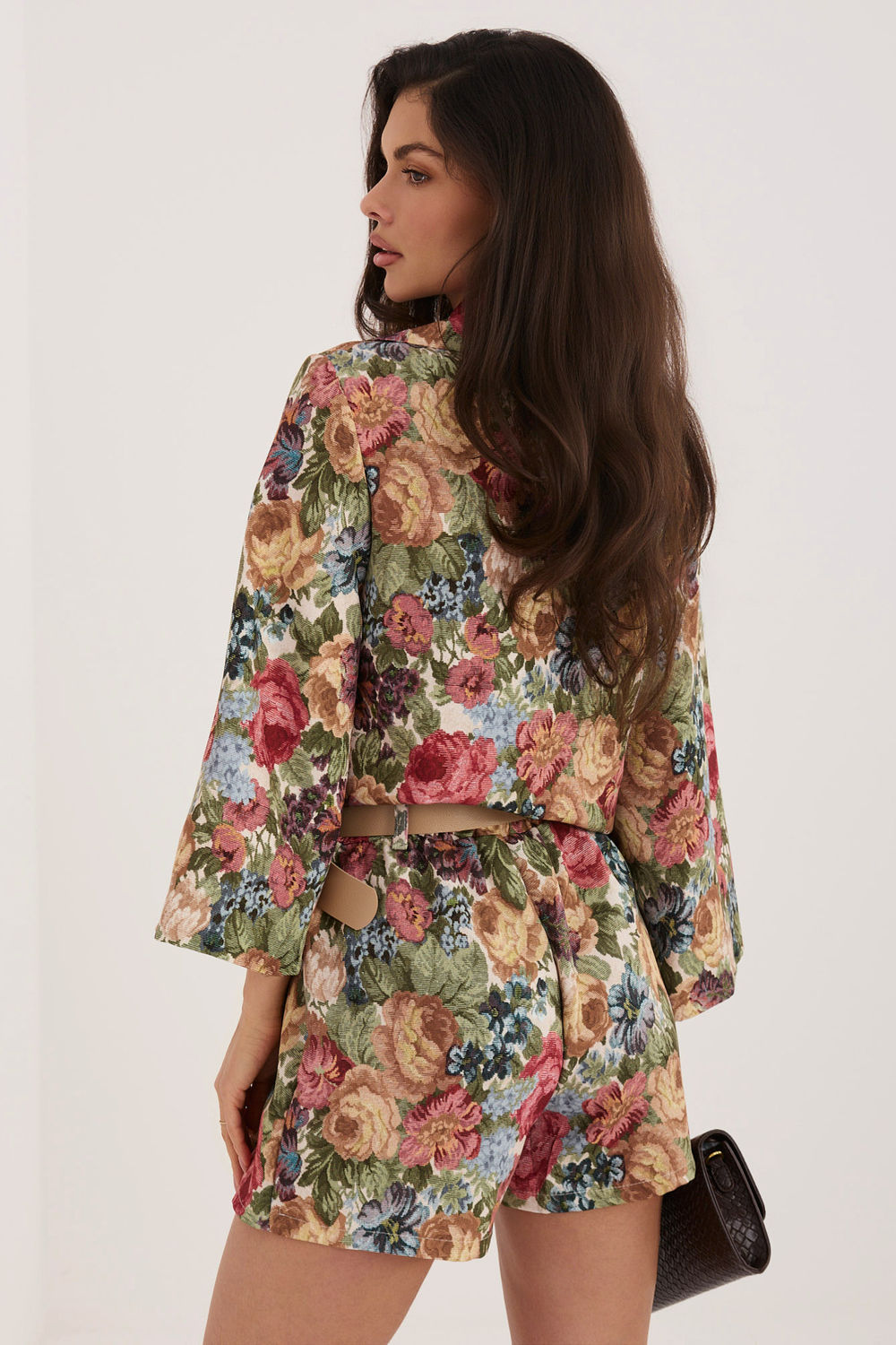 Elegante shorts met een subtiele, bloemige print die perfect zijn voor zowel kantooroutfits als voor visitegelegenheden. Ze combineren de vrouwelijke uitstraling van een rok met het comfort van shorts, wat zorgt voor vrijheid van beweging en een stijlvolle uitstraling. Gemaakt van een hoogwaardige mix van polyester en elastaan, garanderen ze comfort tijdens het dragen en een goede pasvorm voor het figuur. De brede pijpen geven een gevoel van lichtheid en elegantie, en vallen mooi tijdens beweging. Het model is voorzien van een elastische band aan de achterkant, wat het comfort verhoogt en het aanpassen vergemakkelijkt. Daarnaast accentueert een gestrikt riem de taille en vormt het een stijlvolle details. Aan de voorkant zit een opvallende rok-insert met plooien, die het geheel een unieke, vrouwelijke uitstraling geeft.