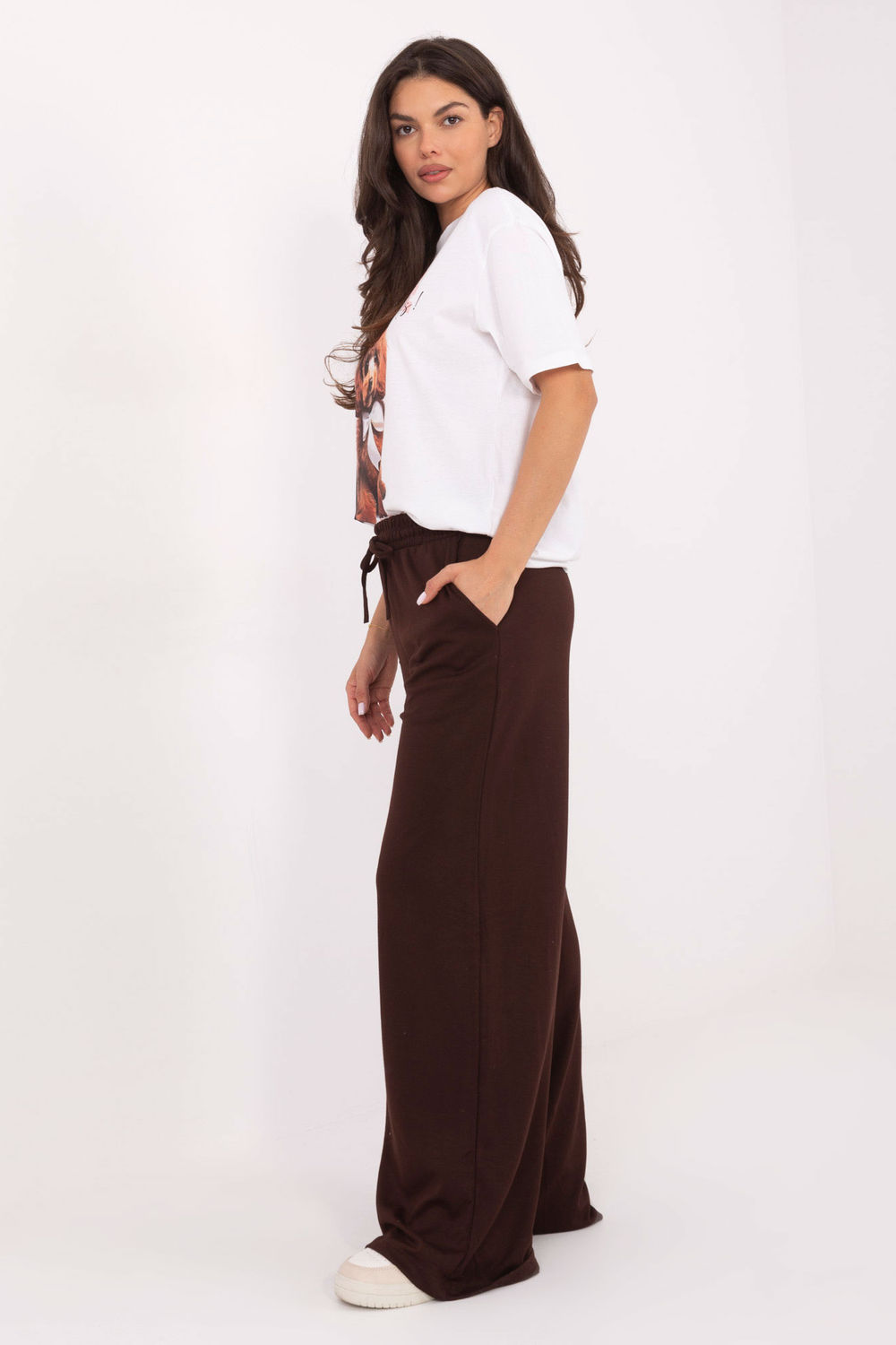 Broek in casual stijl, ideaal voor dagelijks gebruik. Gemaakt van een zachte mix van viscose, polyester en elastaan, bieden ze comfort, ventilatie en lichte elasticiteit van het materiaal. Het gladde weefpatroon geeft ze een universeel karakter, waardoor ze gemakkelijk kunnen worden gecombineerd met veel verschillende outfits. Het model heeft een hoge taille en wijde pijpen die mooi vallen tijdens het bewegen, waardoor de relaxte pasvorm wordt benadrukt. In de taille is een praktische strik toegevoegd voor een perfecte pasvorm, en de zijdelingse steekzakken zorgen voor functionaliteit. Modern en comfortabel, een geweldige keuze voor alledaagse, casual outfits.