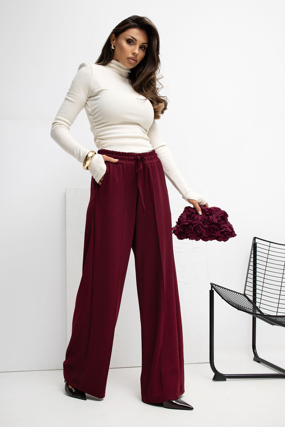 Zachte palazzo joggingbroek gemaakt van extreem zacht, elastisch en aangenaam aanvoelend materiaal. Dankzij de hoge taille en wijde pijpen ligt het model mooi op het lichaam, terwijl het tegelijkertijd comfortabel is om te dragen. Aan de voorkant zijn er subtiele, decoratieve stiksels die de broek een elegante uitstraling geven en optisch de benen verlengen. In de taille is er een comfortabele strik voor een perfecte pasvorm, en de zijdelingse insteekzakken benadrukken de casual stijl en functionaliteit van het model. Het gladde materiaal met een mix van elastaan en voornamelijk viscose maakt de broek luchtig, elastisch en perfect voor dagelijkse outfits, zowel voor werk als voor vrije tijd. Een ideale keuze voor mensen die comfort waarderen in combinatie met een moderne, minimalistische stijl.