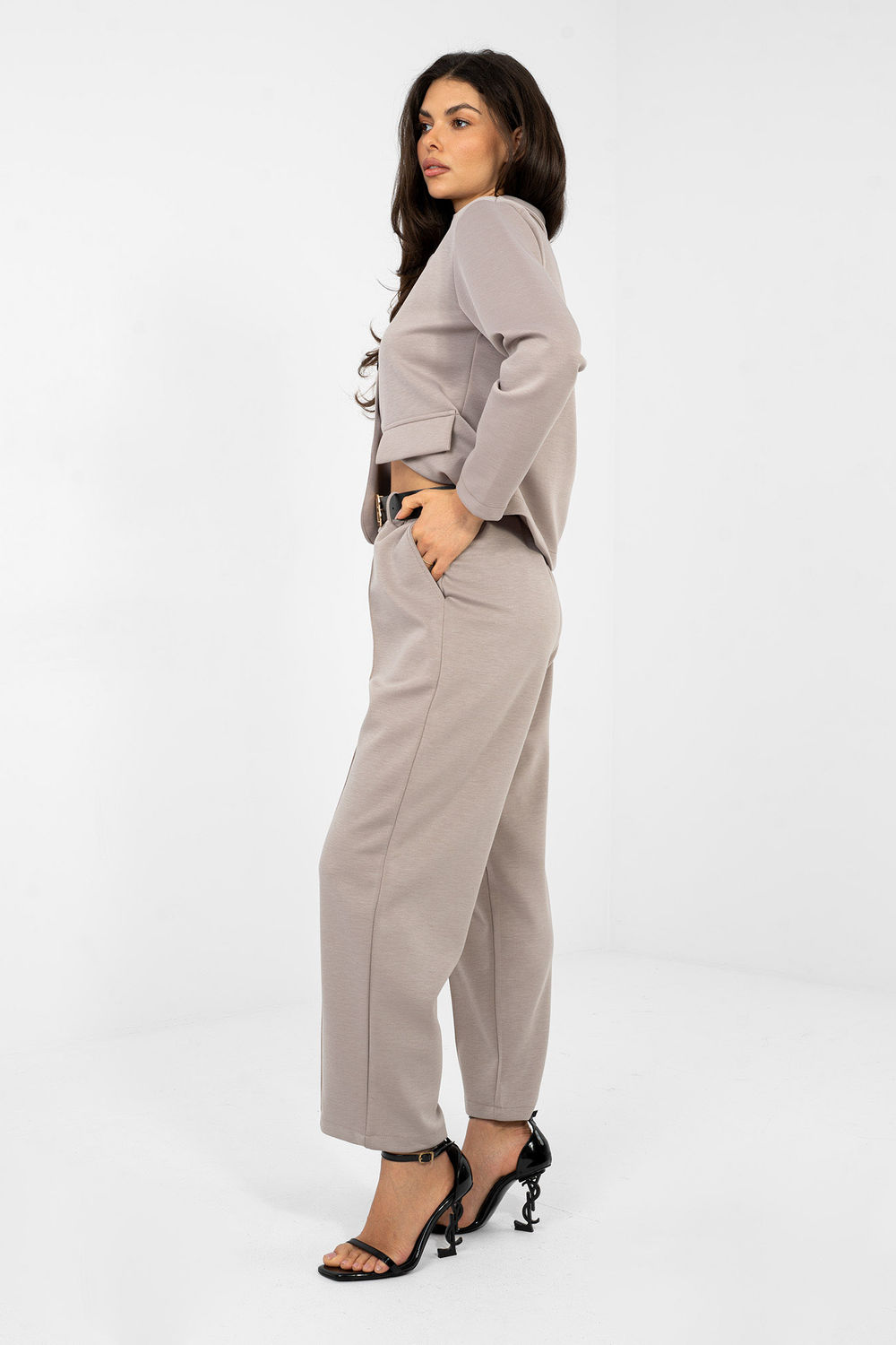 Moderne sweatpants met een elegante uitstraling die perfect zijn voor dagelijks gebruik, werk en speciale gelegenheden. Het ideale combinatie van comfort en stijl in een moderne stijl. Gemaakt van hoogwaardige viscose met een vleugje elastaan, zorgen voor comfortabel dragen, zachtheid en bewegingsvrijheid. Het gladde patroon en de doordachte snit geven ze een elegante uitstraling. Het model met een hoge taille en smalle pijpen, die zijn doorgestikt in een zoom, verlengen optisch de benen en benadrukken de silhouet. Het ontbreken van een klassieke sluiting verhoogt het gebruiksgemak, en de steekzakken voegen functionaliteit toe. Een extra voordeel is de riem met sluitingsoptie, die de taille benadrukt en de broek een meer elegante uitstraling geeft. De ideale keuze voor vrouwen die comfortabele sweatpants waarderen gecombineerd met een elegante stijl.