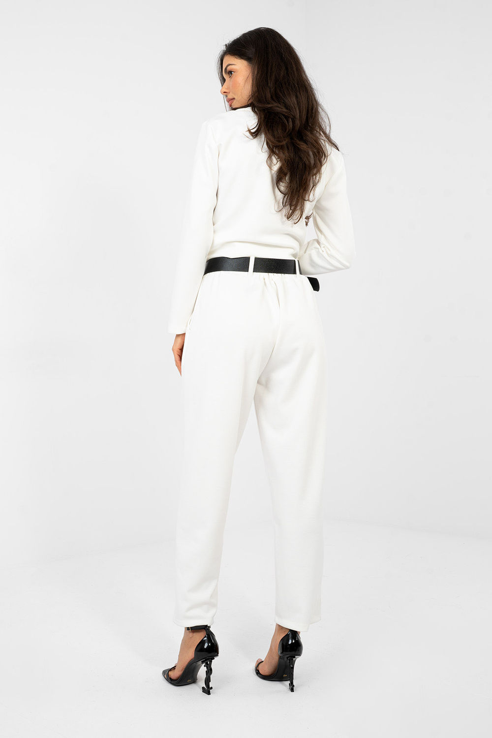 Moderne trainingsbroek met een elegante uitstraling, die perfect is voor dagelijks gebruik, op het werk en voor speciale gelegenheden. Het is de perfecte combinatie van comfort en stijl in een moderne stijl. Gemaakt van hoogwaardige viscose met een vleugje elastaan, bieden ze comfortabel dragen, zachtheid en bewegingsvrijheid. Het gladde patroon en de doordachte snit geven ze een elegante uitstraling. Het model met een hoge taille en smal toelopende pijpen, die zijn gestikt in een vouw, verlengen optisch de benen en accentueren het silhouet. Het ontbreken van een klassieke sluiting verhoogt het draagcomfort, en de insteekzakken voegen functionaliteit toe. Een extra voordeel is de riem met een sluitingsoptie, die de taille benadrukt en de broek een meer elegante uitstraling geeft. Dit is de ideale keuze voor vrouwen die comfortabele trainingsbroeken waarderen gecombineerd met een elegante stijl.