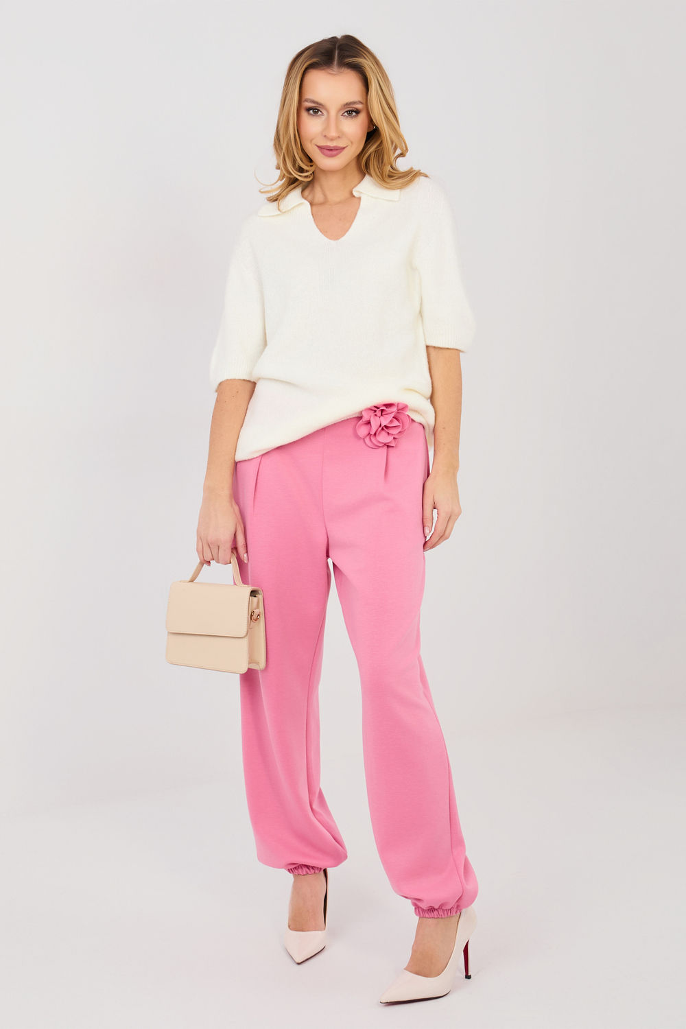 Elegante joggingbroek met manchetten is een combinatie van comfort en stijlvolle afwerking. Het model met lange pijpen eindigend in manchetten valt perfect op het lichaam, waardoor het geheel een moderne uitstraling krijgt. Het gladde patroon benadrukt hun veelzijdigheid en maakt ze ideaal voor zowel alledaagse als meer verfijnde outfits. De elastische tailleband zorgt voor een comfortabele pasvorm en comfortabel dragen gedurende de hele dag. De zijzakken voegen functionaliteit toe, en de subtiele bloemvormige broche vormt een elegante, vrouwelijke accent. De broek is gemaakt van een bijzonder aangenaam aanvoelend materiaal, zoals boterachtige en zachte mix van polyester, viscose en elastaan. De stof valt mooi op het lichaam, zorgt voor bewegingsvrijheid en hoog draagcomfort. Dit is een ideale keuze voor vrouwen die comfort waarderen in een elegante stijl.