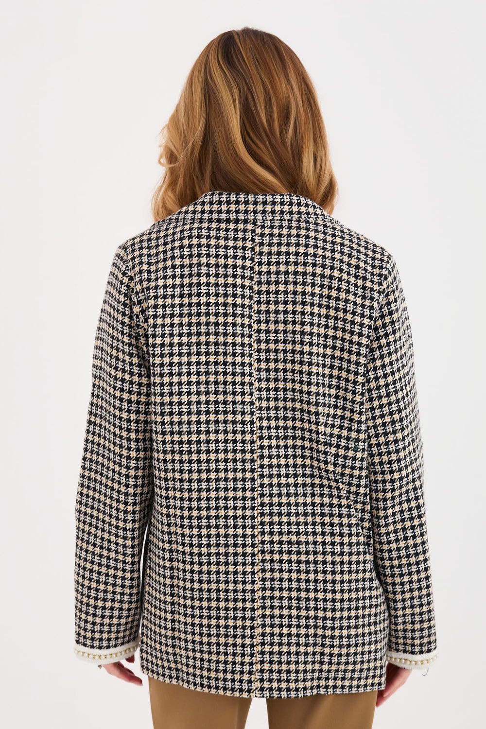 Blazer van tweed in een elegante, klassieke snit, gemaakt van hoogwaardig katoen, ideaal voor de herfst, winter en lente. Model van standaard lengte, met lange mouwen en een dubbele knoopsluiting. Revers, manchetten en opgestikte zakken versierd met subtiele parels, die de blazer een chique en vrouwelijk karakter geven. De blazer heeft een voering, een glad geruit patroon en is niet gevoerd, waardoor hij zowel geschikt is voor dagelijkse als formele stijlen, op het werk en bij elegante gelegenheden.