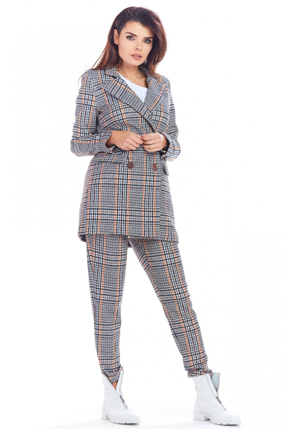Losjes vallend jasje met rechte mouwen en een dubbele kraag. Het heeft een knoopsluiting en zakken. Gemaakt van modieuze geruite stof. Het past niet alleen bij elegante maar ook bij alledaagse outfits. Creëer een stijlvol pak met onze A365 broek. Verkrijgbaar in twee kleuren: marineblauw en bruin. Product ontworpen en genaaid in Polen.