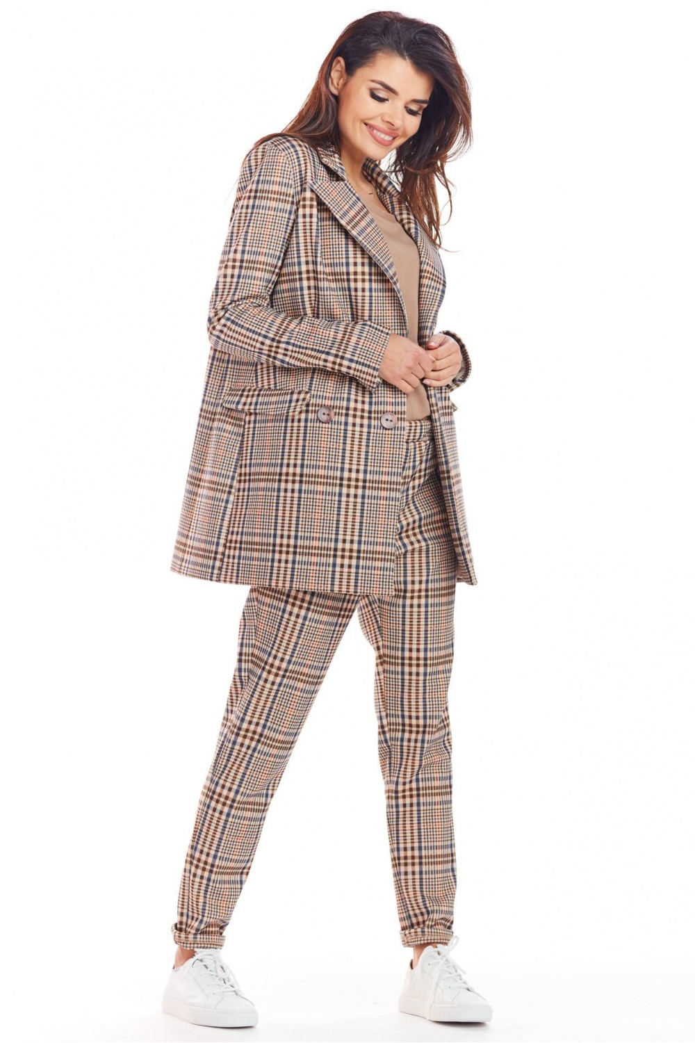 Losjes vallend jasje met rechte mouwen en een dubbele kraag. Het heeft een knoopsluiting en zakken. Gemaakt van modieuze geruite stof. Het past niet alleen bij elegante maar ook bij alledaagse outfits. Creëer een stijlvol pak met onze A365 broek. Verkrijgbaar in twee kleuren: marineblauw en bruin. Product ontworpen en genaaid in Polen.