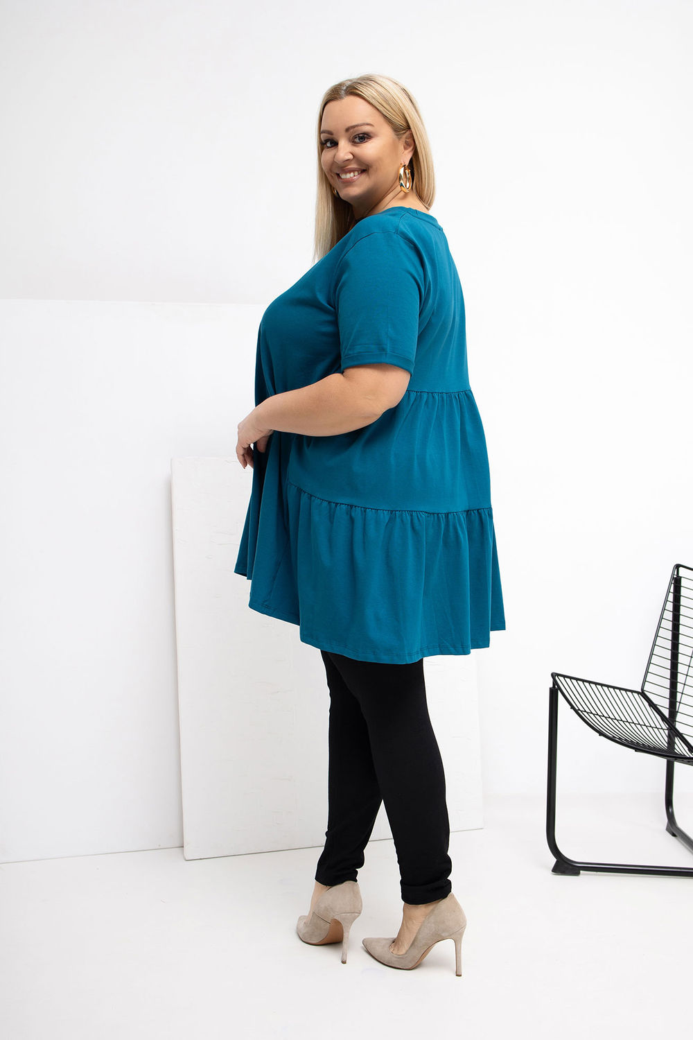 Verlengd casual shirt, ideaal voor dagelijkse gelegenheden. Gemaakt van aangename katoen met een vleugje elastaan, waardoor het zacht, elastisch en comfortabel is om de hele dag te dragen. Het gladde patroon zorgt ervoor dat het shirt gemakkelijk bij veel verschillende outfits past. Het model heeft een ronde halslijn en korte mouwen, wat het een universeel, relaxed karakter geeft. Het ontbreken van sluitingen benadrukt de eenvoudige, comfortabele vorm. Een extra voordeel is de ruche aan de onderkant aan de achterkant, die subtiel de stijl levendig maakt en het een vrouwelijke charme geeft. Een ideaal voorstel voor dagelijks gebruik met jeans, leggings of een rok.