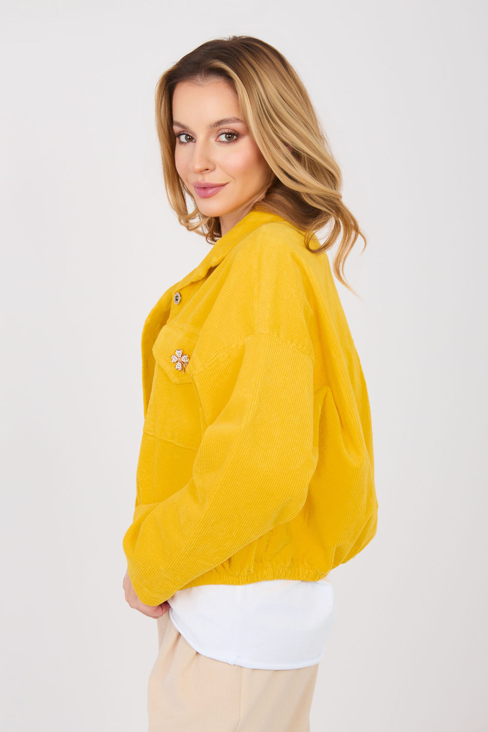 Moderne, casual corduroy damesjack, ideaal voor dagelijkse, overgangsdagen. Dit model combineert een klassieke bomberjack-stijl met een trendy, licht retro afwerking, waardoor het een veelzijdige optie is voor vele outfits. Het jack is gemaakt van hoogwaardig katoen met een beetje elastaan, wat zorgt voor comfortabel dragen en een lichte flexibiliteit van de stof. Het heeft een glad patroon, een korte pasvorm en lange mouwen die een lichte en moderne uitstraling geven. Praktische zakken met kleppen aan de voorkant zorgen voor comfortabel opbergen van kleine spullen, en de knoopsluiting en elastische band onderaan zorgen voor een goede pasvorm en draagcomfort. Een extra voordeel zijn de afneembare decoratieve broches, waarmee je de uitstraling van het jack kunt personaliseren. Het model is afgewerkt met een klassieke kraag die de elegante aard van de bomberjack benadrukt, terwijl het casual, ontspannen stijl behoudt. Dit is de ideale keuze voor vrouwen die op zoek zijn naar een praktisch en stijlvol jack voor de lente of herfst.