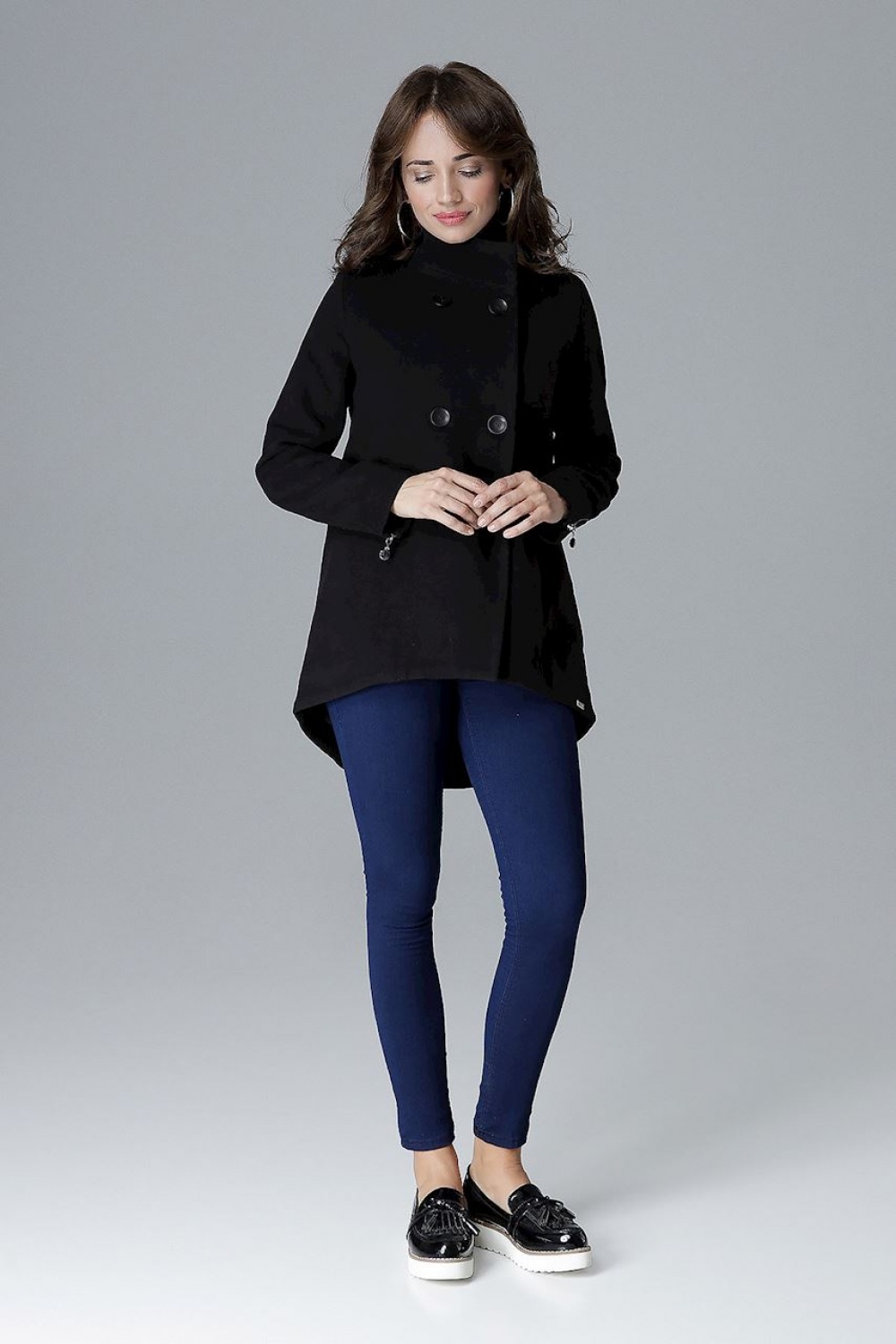 Modieus jasje met een knopenlijst met twee knopen. Kraag met karakteristieke, vrij hoge opstaande kraag. Mouwen met ritssluiting voor een moderne touch, langere rug met contrasterende rits, zakken in de zijnaden. Jas met een universeel, onconventioneel karakter.