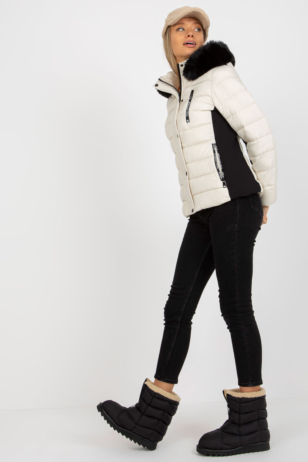 Gewatteerd donsjack met lange mouwen, rits en drukknopen. De jas is volledig gevoerd, met zakken met rits. De jas heeft een afneembare capuchon met decoratief bont.