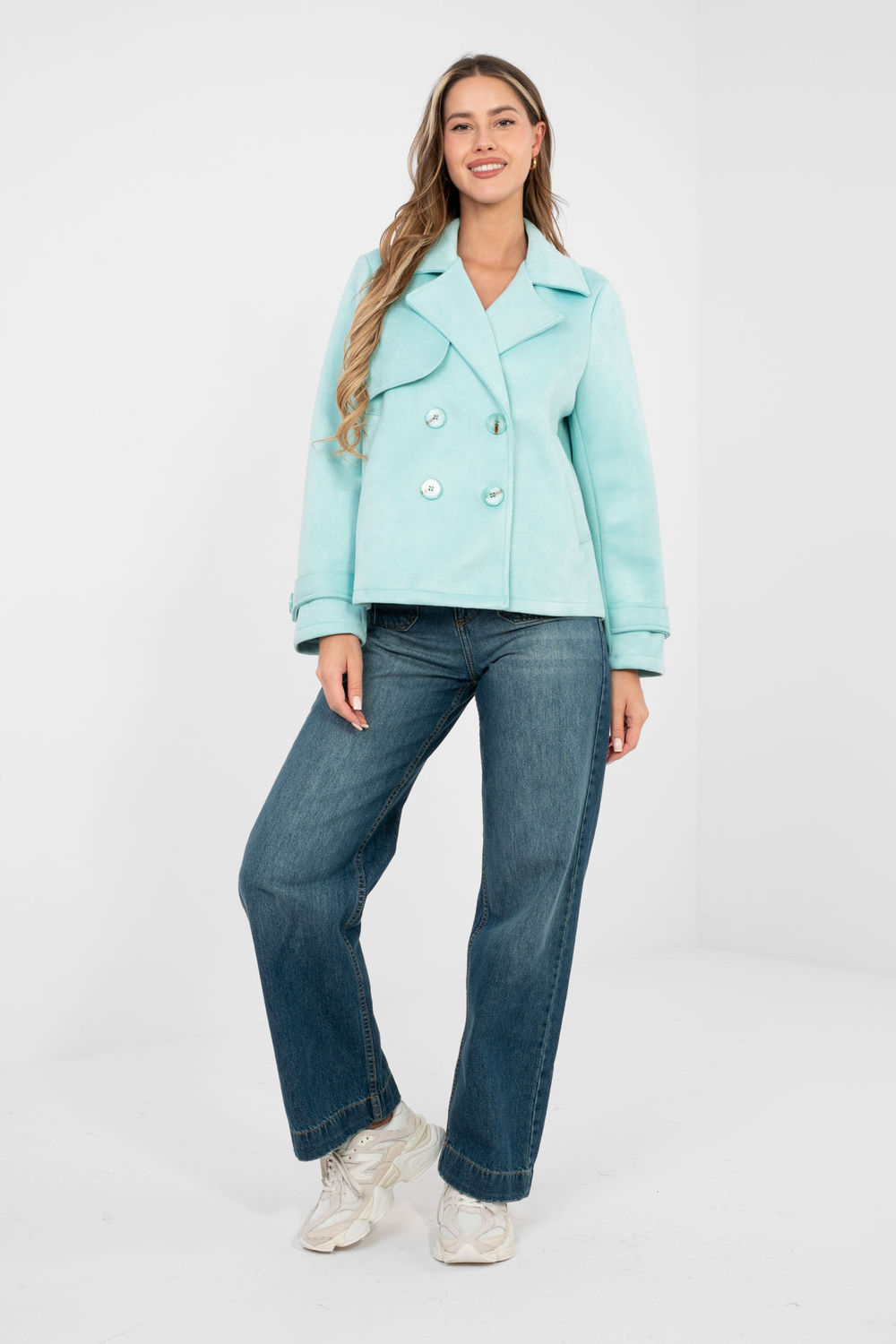 Suède overgangsjas voor dames is een stijlvol voorstel in een casual uitvoering, ideaal voor dagelijks gebruik. Het zal perfect werken in de herfst, winter en lente als een lichte buitenste laag die het karakter van elke outfit benadrukt. Het model van korte lengte is gemaakt van aangenaam aanvoelend materiaal op basis van polyester met een vleugje elastaan. De gladde textuur geeft het een elegante eenvoud, terwijl de licht elastische stof comfortabel dragen en bewegingsvrijheid garandeert. De jas heeft geen voering of vulling, waardoor hij perfect is voor tussenseizoenen. Het dubbele knoopsluiting benadrukt de klassieke snit, terwijl de kraag met revers de hele look elegantie geeft. De lange mouw versierd met een riem met knoop is een subtiel, stijlvol detail. Praktische insteekzakken verhogen de functionaliteit van het model. Het is een veelzijdige jas die je gemakkelijk kunt combineren met zowel jeans en laarzen als met meer elegante, alledaagse outfits.