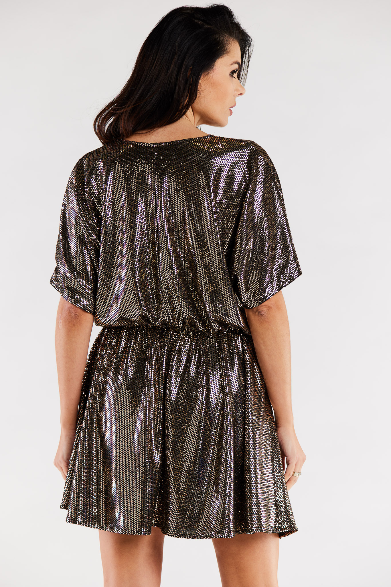 Korte, uitlopende jurk met korte mouwen en een sweetheart halslijn. Elastische plooi in de taille om de pasvorm aan te passen. Jurk is genaaid op een elastische voering. Jurk gemaakt in Polen.