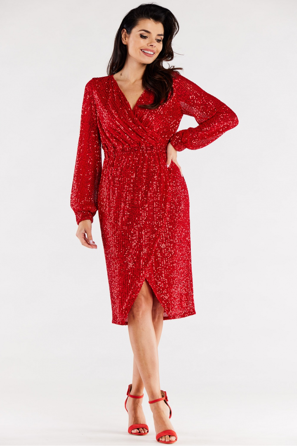 Een pailletten enveloppe jurk met wijdere mouwen en een ruche aan de manchet. Breed elastiek in de taille voor een flatterende pasvorm. Jurk genaaid met elastische voering. Jurk gemaakt in Polen.