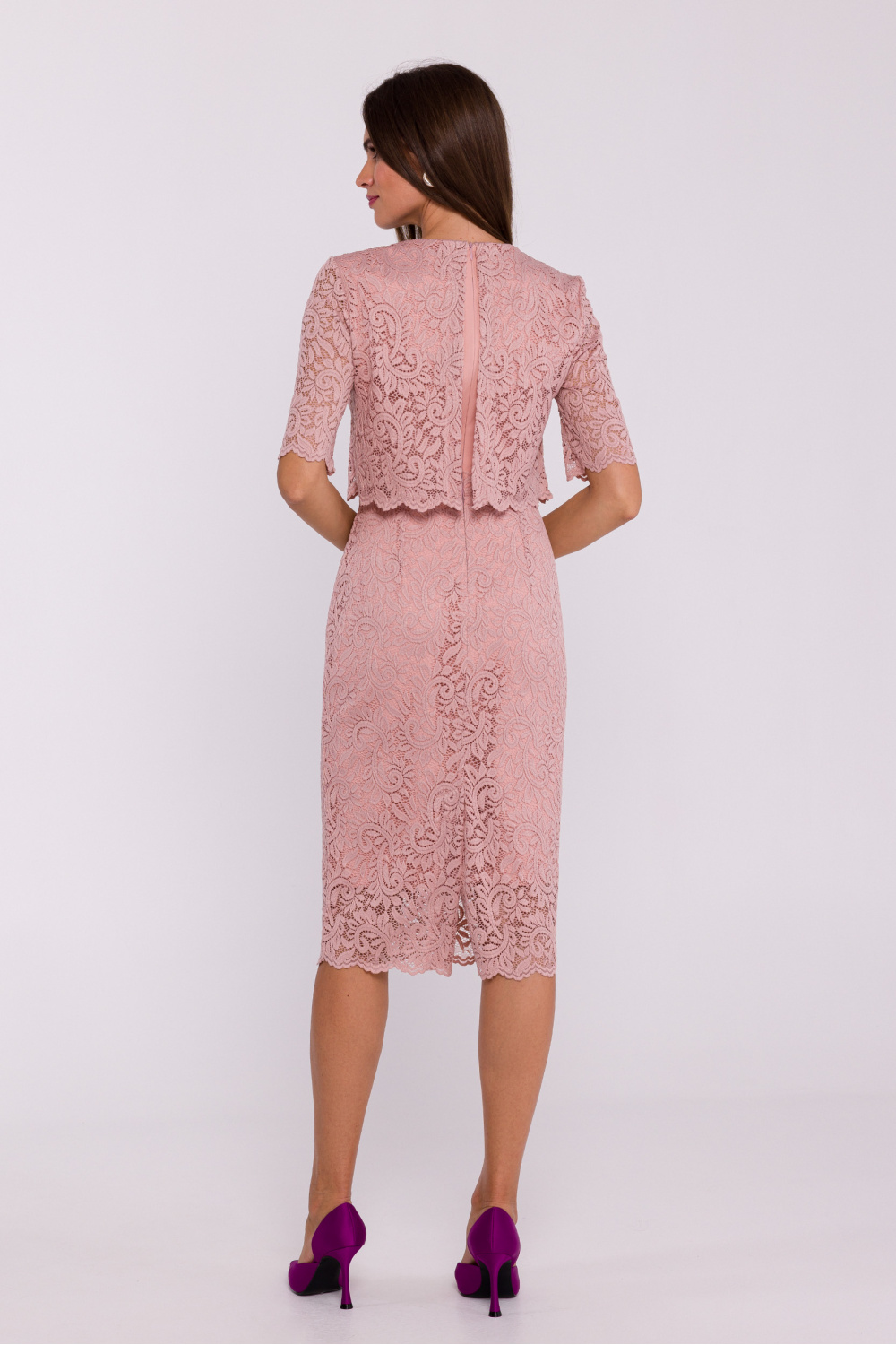 Een elegante dubbellaagse kokerjurk die een klassieke effen stof aan de onderkant combineert met een delicate kanten buitenlaag om een chique en vrouwelijke look te creëren. De jurk is afgesneden in de taille, wat de taille accentueert en proportie toevoegt aan het silhouet. Korte kanten mouwen voegen lichtheid en subtiele charme toe. De lengte onder de knie en de split op de rug zorgen voor comfort en bewegingsvrijheid, terwijl het elegante karakter van de styling wordt benadrukt. Een bedekte ritssluiting op de rug zorgt voor een discrete aanpassing aan het figuur. De jurk is ontworpen en genaaid in Polen, waardoor vakmanschap en aandacht voor detail van de hoogste kwaliteit gegarandeerd zijn. Ideaal voor speciale gelegenheden wanneer u er elegant en stijlvol uit wilt zien.