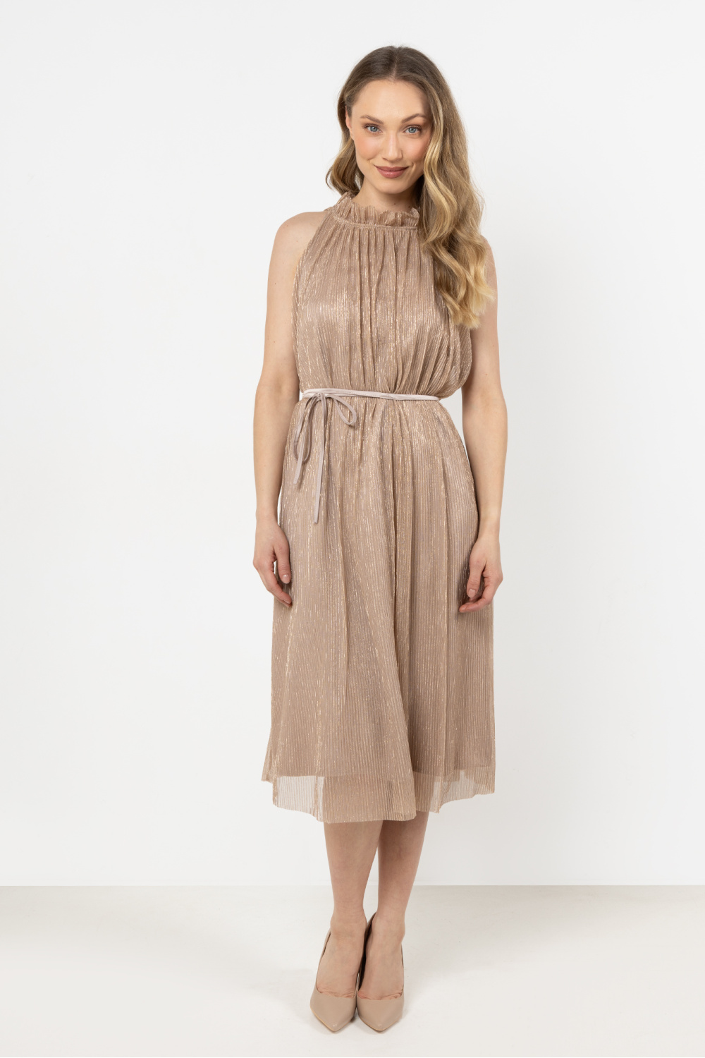 Elegant en modern, deze jurk is de ideale keuze voor speciale gelegenheden. De trapeze snit en onthulde schouders geven het een lichte uitstraling, terwijl de satijnen riem in de taille subtiel de silhoutte benadrukt. De halterdecolleté voegt een vleugje stijl toe, en de satijnen voering zorgt voor draagcomfort. Het is perfect voor elegante feesten en bijzondere vieringen.