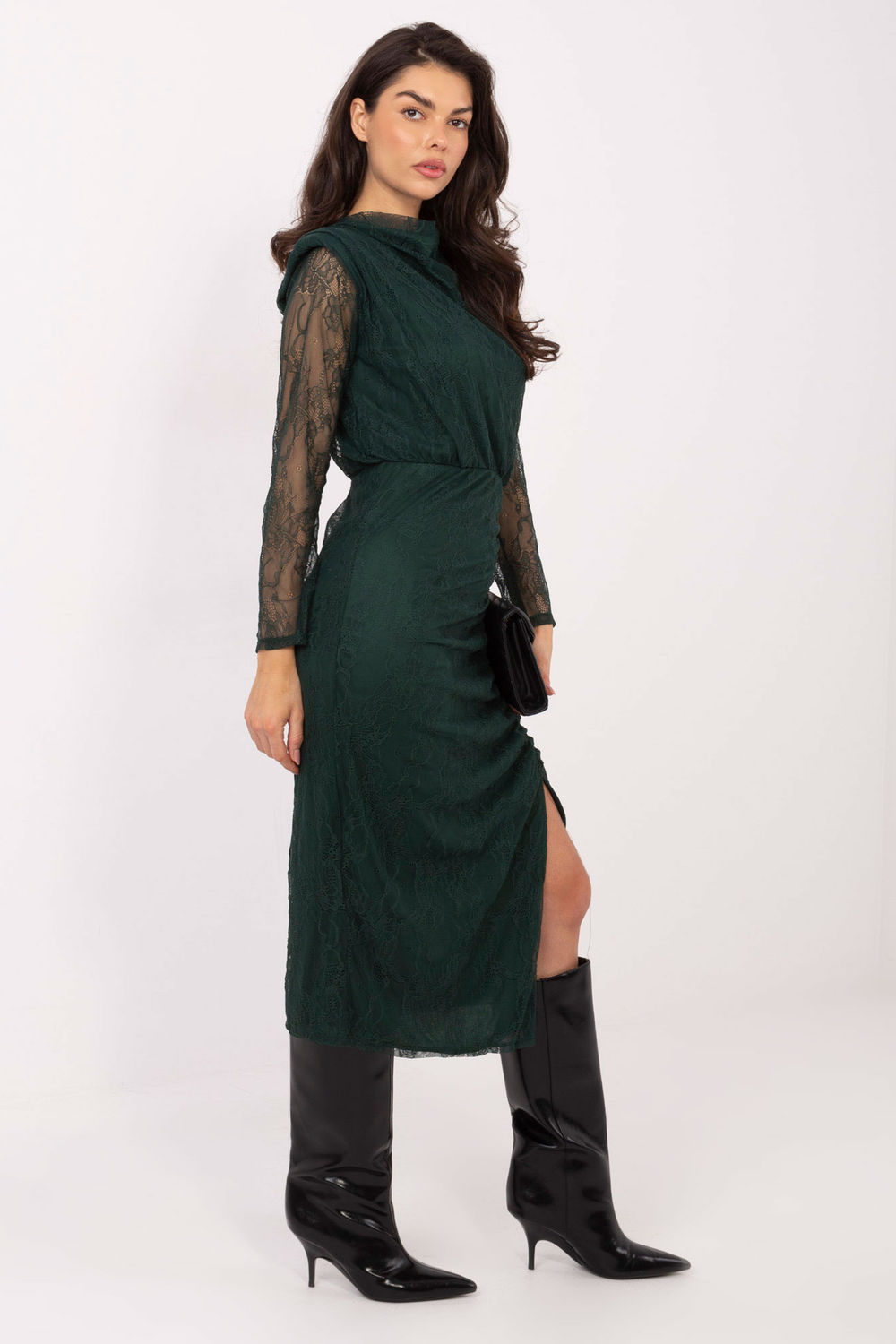 Elegante kanten jurk met een klassiek en tegelijkertijd zeer vrouwelijk karakter, ideaal voor formele gelegenheden. Het potloodmodel benadrukt prachtig de silhouet, en de elastische tailleband zorgt voor comfortabel dragen en een uitstekende pasvorm. Het model is gemaakt van hoogwaardige viscose met een vleugje elastaan, waardoor de stof zacht, elastisch en comfortabel in gebruik is. De gevarieerde textuur van de stof en de kant geven de jurk een elegante en luxe uitstraling. De midi-lengte in combinatie met lange mouwen zorgt ervoor dat het geheel er uiterst stijlvol en tijdloos uitziet. De opvallende golvende halslijn voegt lichtheid en subtiele sensualiteit toe, terwijl de plooien aan de voorkant onderaan met een split het silhouet benadrukken en bewegingsvrijheid bieden. De jurk heeft geen sluiting en wordt over het hoofd aangetrokken. Het model is voorzien van schoudervullingen die elegantie geven en de schouderlijn benadrukken, evenals een voering, met uitzondering van de mouwen, wat het comfort en de esthetiek van de afwerking verhoogt. Dit is een uitstekende keuze voor feestelijke gelegenheden, officiële bijeenkomsten en speciale uitstapjes.