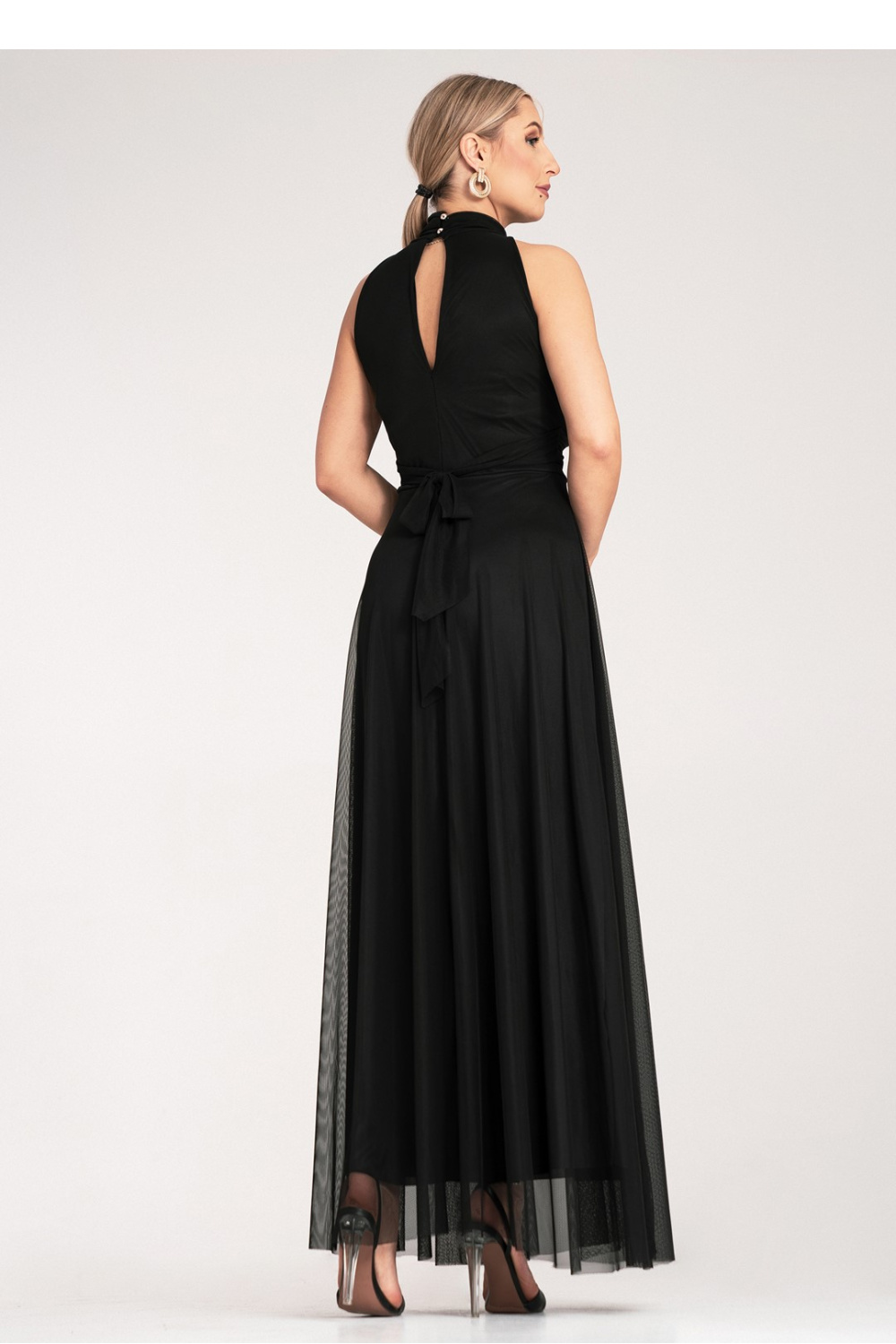 Maxi jurk met een halternek die de vorm van de nek en schouders benadrukt. Aansluitend, gerimpelde taille die de silhouet vormt.