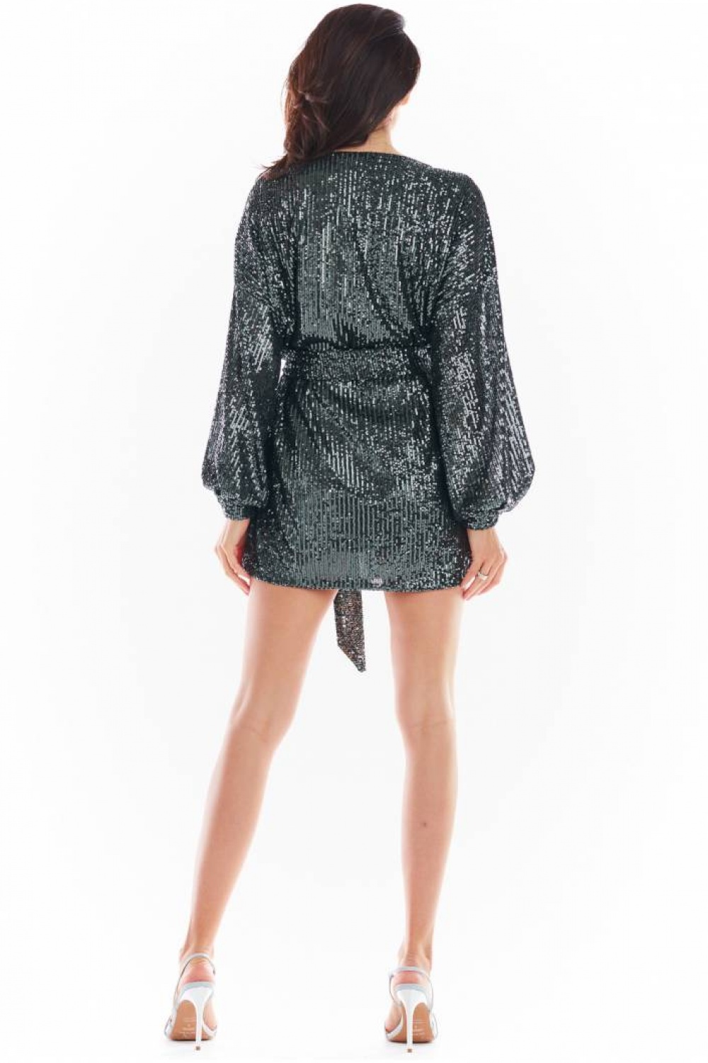 Jurk in paillettenstof. Wijde, vloeiende mouwen afgewerkt met een manchet met een elastische band. Kan op twee manieren gedragen worden, met of zonder tailleband. Bijgevoegde taille riem gemaakt van hetzelfde materiaal als de jurk. Jurk is ontworpen en genaaid in Polen