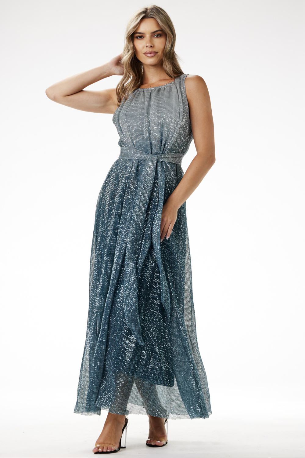 Elegante avond maxi-jurk met ombre-effect. Fenomenale avond maxi-jurk van lovertjesbreisel met een uniek ombre-effect, dat verloopt van lichtgrijs naar diepblauw. Ideaal voor elegante feesten en speciale avonden. Het ombre-effect en de glinsterende pailletten geven de jurk een unieke fonkeling, perfect voor oudejaarsavond, bruiloften of elegante feestjes. Het getailleerde model met ceintuur accentueert het silhouet, terwijl de satijnen voering zorgt voor een comfortabele pasvorm. Kies deze jurk om iedereen te verbazen met je styling.