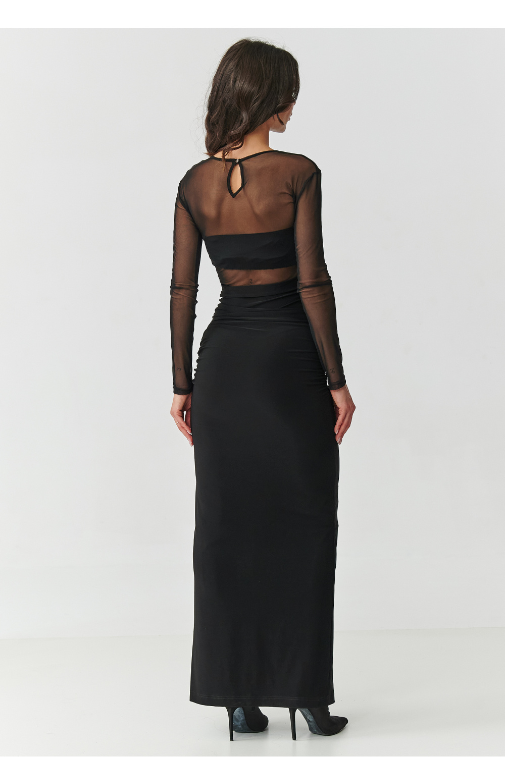 Betreed de wereld van elegantie die hypnotiseert vanaf het eerste gezicht. Deze zwarte maxi-jurk met mesh is een voorstel voor vrouwen die niet bang zijn om te schitteren en zich absoluut uniek willen voelen. De getailleerde pasvorm benadrukt perfect de silhouet, en de subtiele plooien in de taille modelleren het figuur, waardoor het een sensuele lichtheid krijgt. De transparante top van zachte mesh geeft de jurk een mysterieus karakter waar elegantie samenkomt met moed. Daarnaast zit er onder de tule een onafhankelijke top die je kunt gebruiken voor andere styling. Het sensuele split onthult het been bij elke stap, waardoor het geheel vrouwelijke aantrekkingskracht krijgt. De vergulde knoop aan de achterkant heeft niet alleen een praktische functie, maar geeft de jurk ook een juwelierskarakter dat prachtig contrasteert met het diepe zwart van de stof. Dit subtiele accent geeft de jurk een luxe uitstraling en maakt het tegelijkertijd uniek in elk detail. Dit is geen gewone avondjurk, het is een creatie waarin je zult voelen dat alle ogen op jou gericht zijn. Perfect voor bruiloften, gala’s, afstudeerfeesten of elegante diners, het zal altijd zorgen dat je opvalt met stijl en zelfvertrouwen. Gedurfd, hypnotiserend, perfect voor de vrouw die een verpletterende indruk wil maken en een onuitwisbare herinnering wil achterlaten, net als de jurk zelf. Tule: 100% polyester