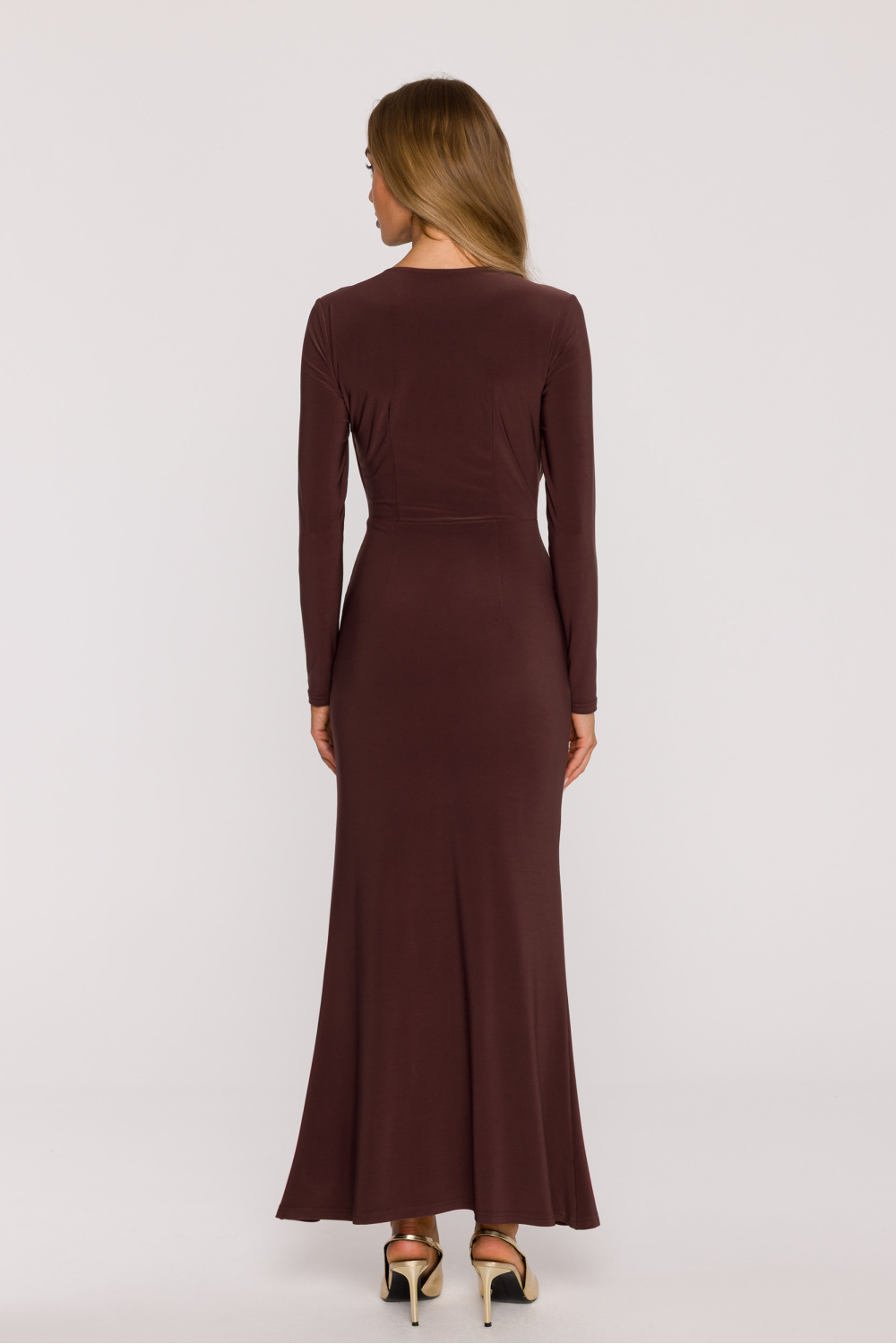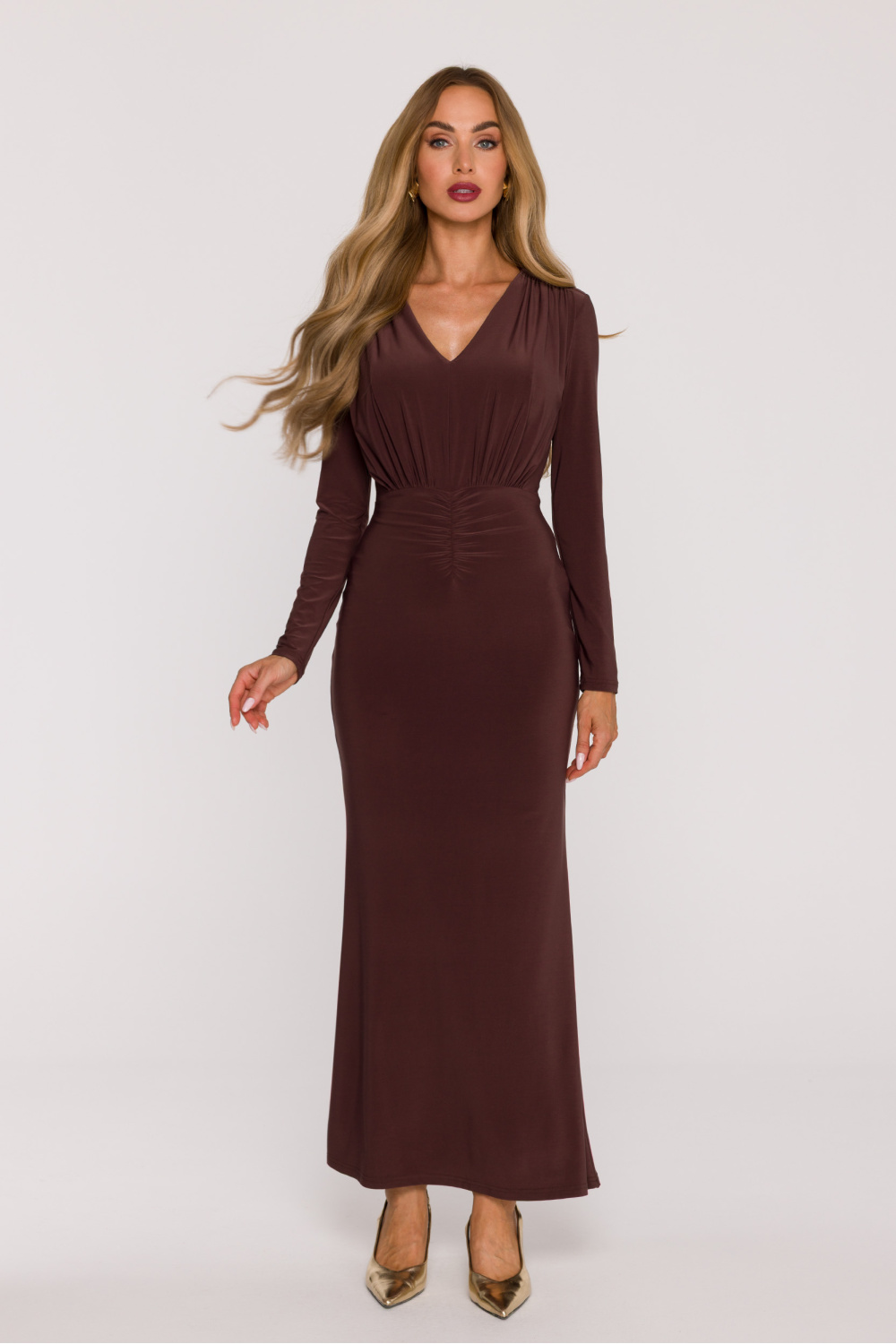 Elegante en uiterst vrouwelijke maxi-jurk M891 gemaakt van gladde stof, die indruk maakt met zijn zachtheid, elasticiteit en comfortabel dragen. De stof past mooi bij de silhouet, zonder de bewegingen te beperken. Het model heeft een V-hals, die subtiel de neklijn en het decolleté benadrukt, en lange, aansluitende mouwen die het geheel een elegante uitstraling geven. De taille met zachte plooien accentueert de vrouwelijke vormen, en de lange, licht uitlopende onderkant creëert een sensuele en slanke silhouetlijn. Een extra troef is de aparte sjaal, die op verschillende manieren gestyled kan worden om rond de nek, taille of als haaraccessoire te dragen. De jurk heeft geen zakken of voering, wat zorgt voor lichtheid, en de verborgen ritssluiting aan de zijkant zorgt voor gemak bij het aantrekken en een esthetische afwerking. Het model is ontworpen en gemaakt in Polen met oog voor elk detail. Dit is een voorstel voor vrouwen die minimalistische elegantie, comfort en tijdloze stijl waarderen.