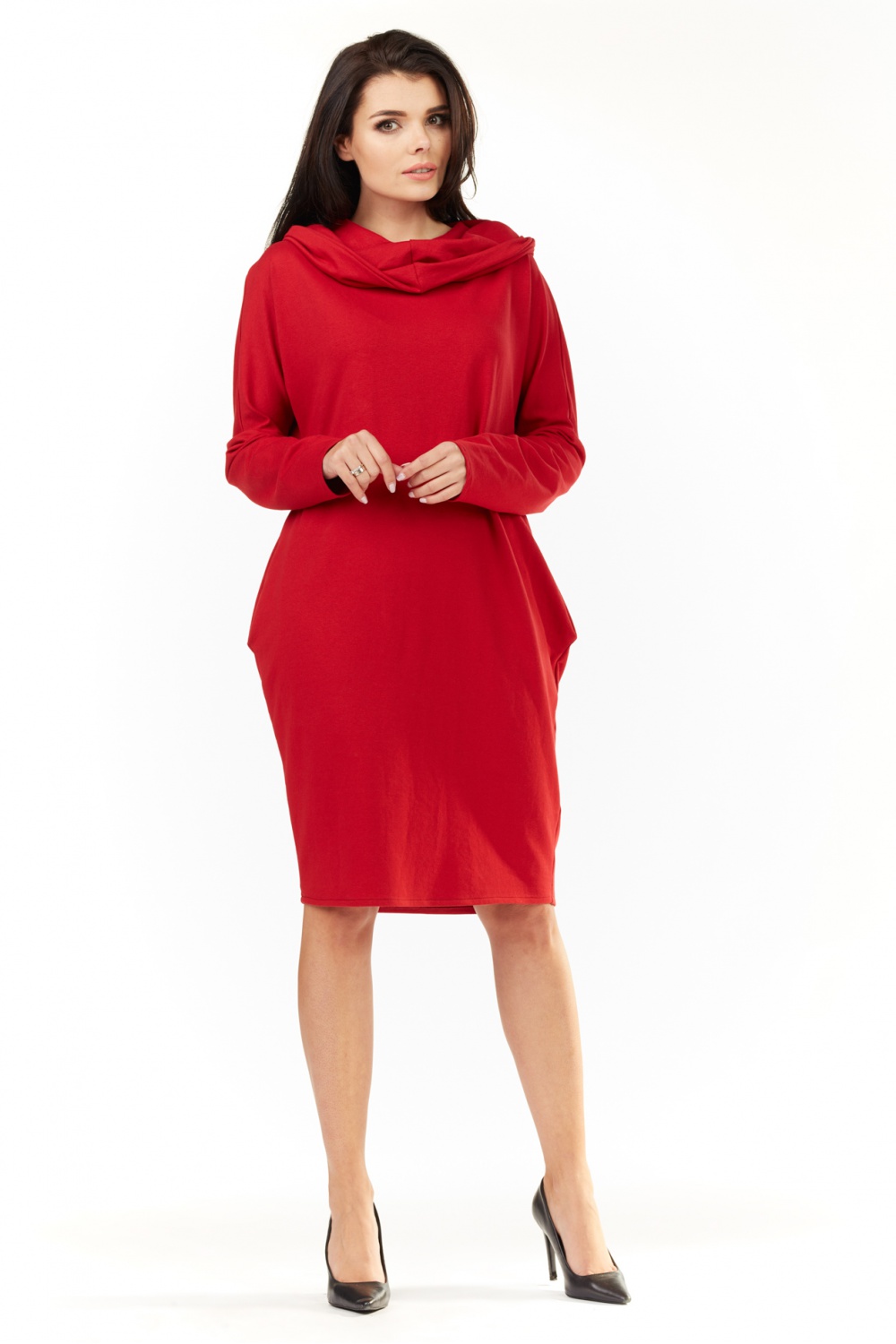 Gebreide jurk met lange mouwen. Jurk in een losse snit met een capuchon. Jurk heeft zakken aan zijkanten. Ideaal voor vele gelegenheden.
