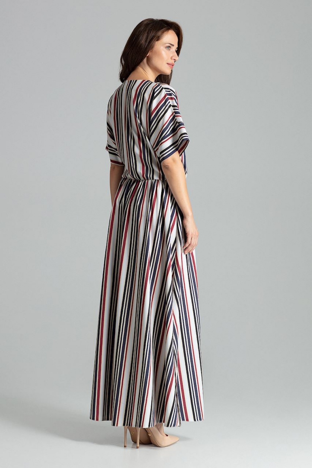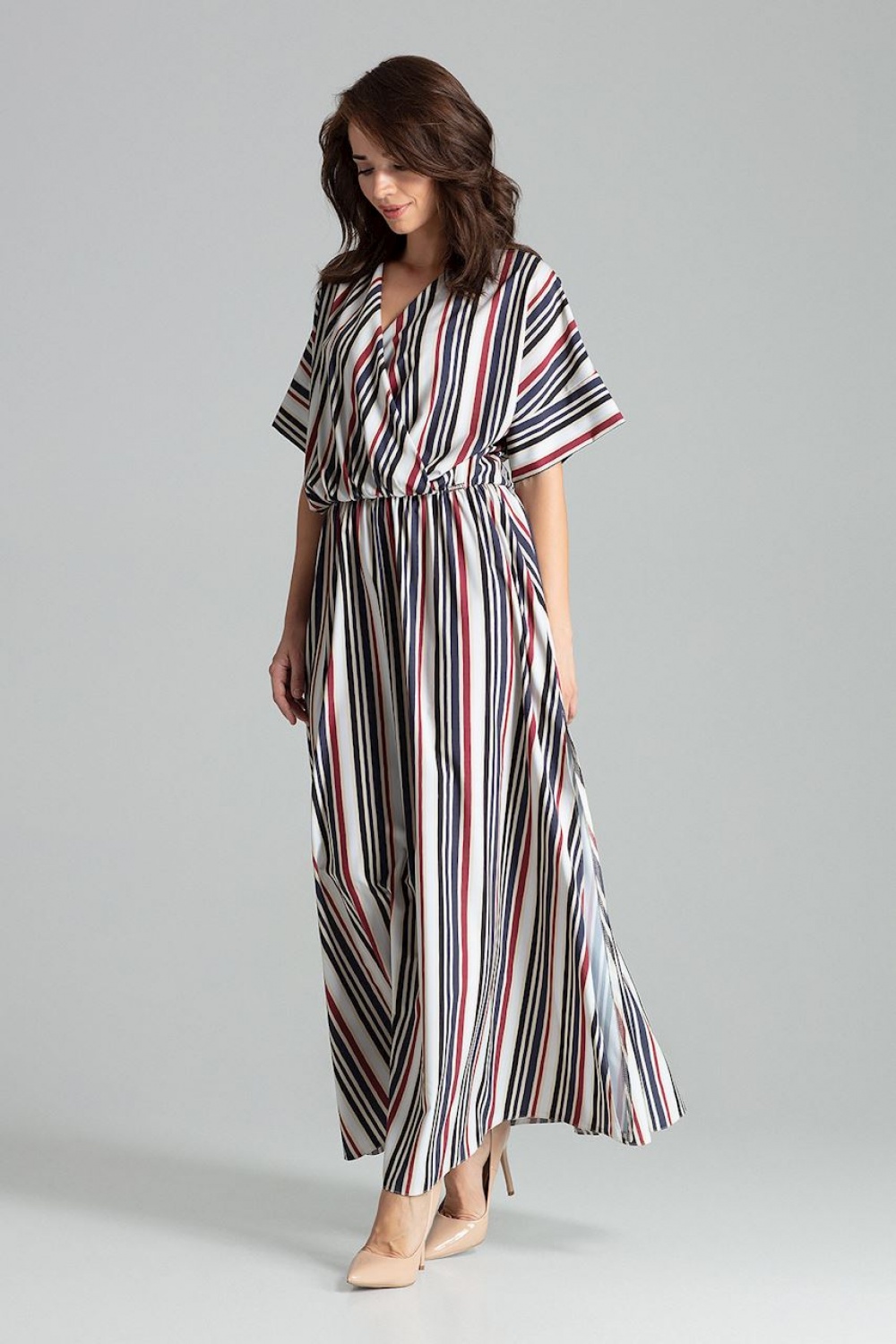 Lange gestreepte jurk met korte kimonomouwen die eindigen in een manchet. De lange rok is in de taille afgesneden, licht uitlopend met zijsplitten. Verstelbaar elastiek in de taille. Envelop halslijn.