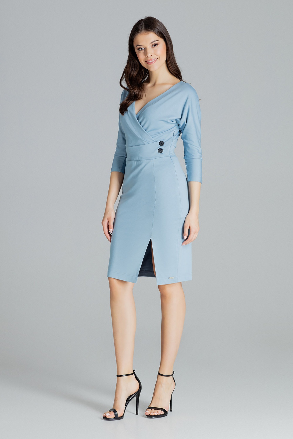 Blauwe getailleerde midi-jurk met kimono 3/4 mouwen, enveloppe halslijn. Decoratieve riem met knopen in de taille. Bedekte ritssluiting aan de zijkant. Delicaat splitje vooraan op het linkerbeen.