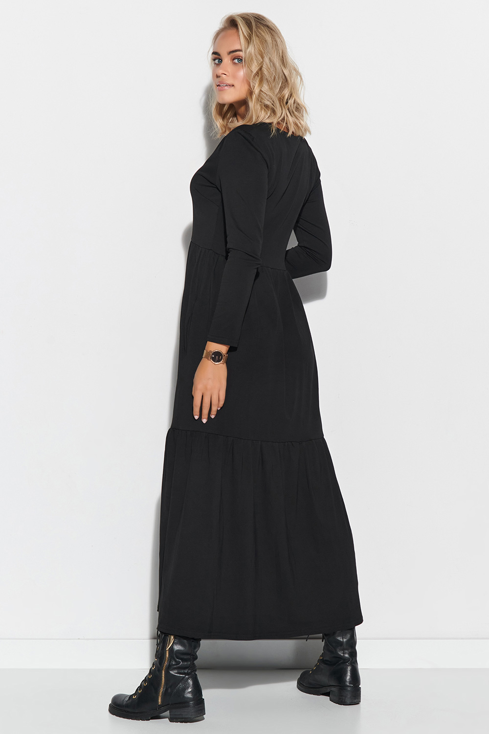 Dames maxi jurk met lange mouwen en een sweetheart halslijn. De jurk is gemaakt van een goede kwaliteit single-linnen katoen, die ideaal is voor bijna elk seizoen. De jurk is lang, en ondanks de eenvoudige snit, maakt hij een ongelooflijke indruk. De hartvormige halsuitsnijding verlengt de hals en accentueert het decolleté, terwijl de lange mouwen de schouders afslanken. De jurk is afgesneden onder de buste, waardoor onvolkomenheden in de buik, dijen en billen worden verdoezeld. Een decoratieve horizontale zoom werd aangebracht op het onderste gedeelte. Het model is verkrijgbaar in twee kleuren: zwart en kaki.