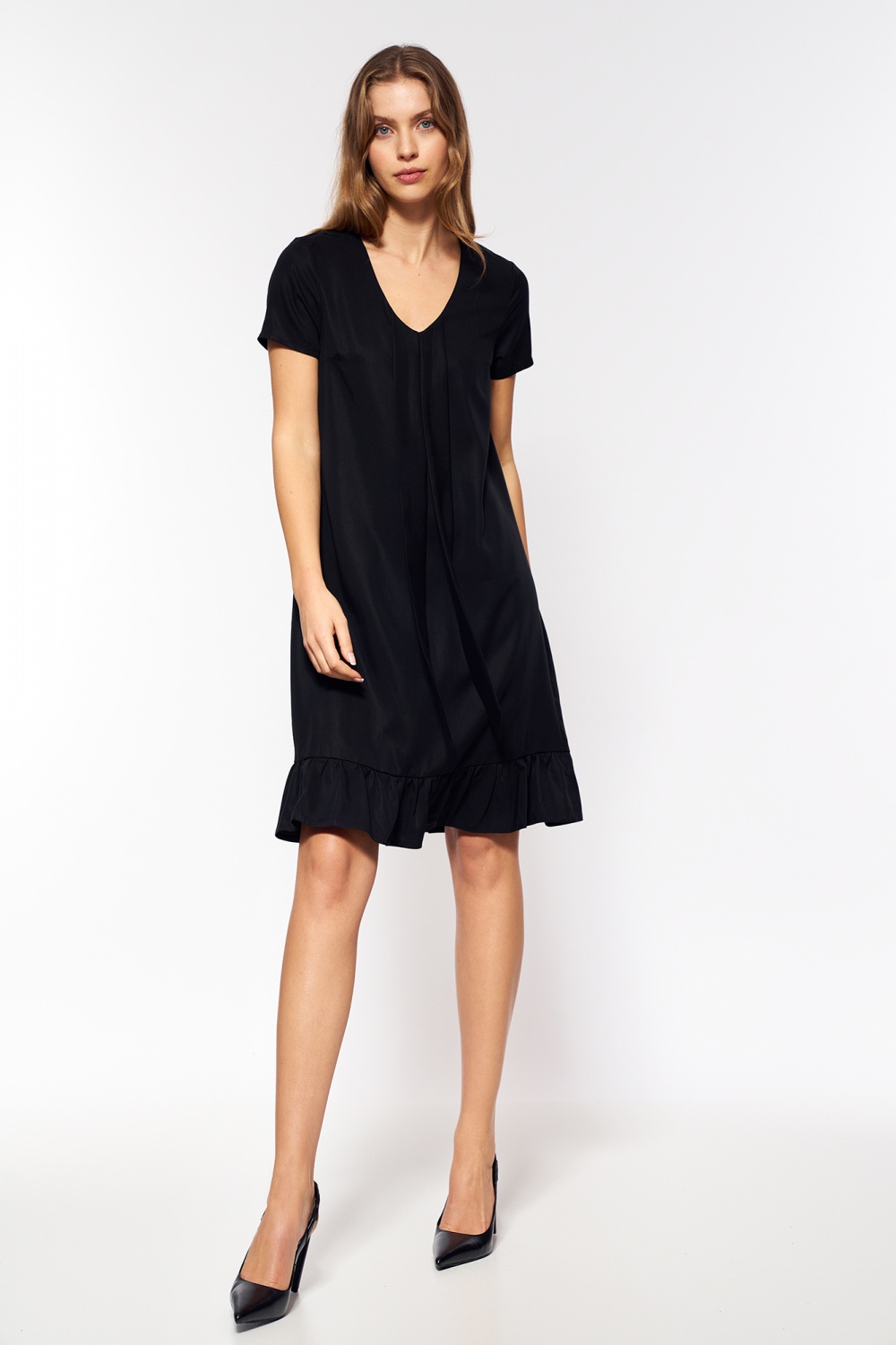 Viscose, losse jurk is een schot in 10 voor warme dagen. Het zal perfect gaan met een jasje en stiletto’s. De tweede versie van de jurk is dichtgeknoopt met een strikceintuur, een ceintuur in de taille, gympen en een weekendlook klaar om te gaan. Dit model zou in ieders garderobe thuishoren!
