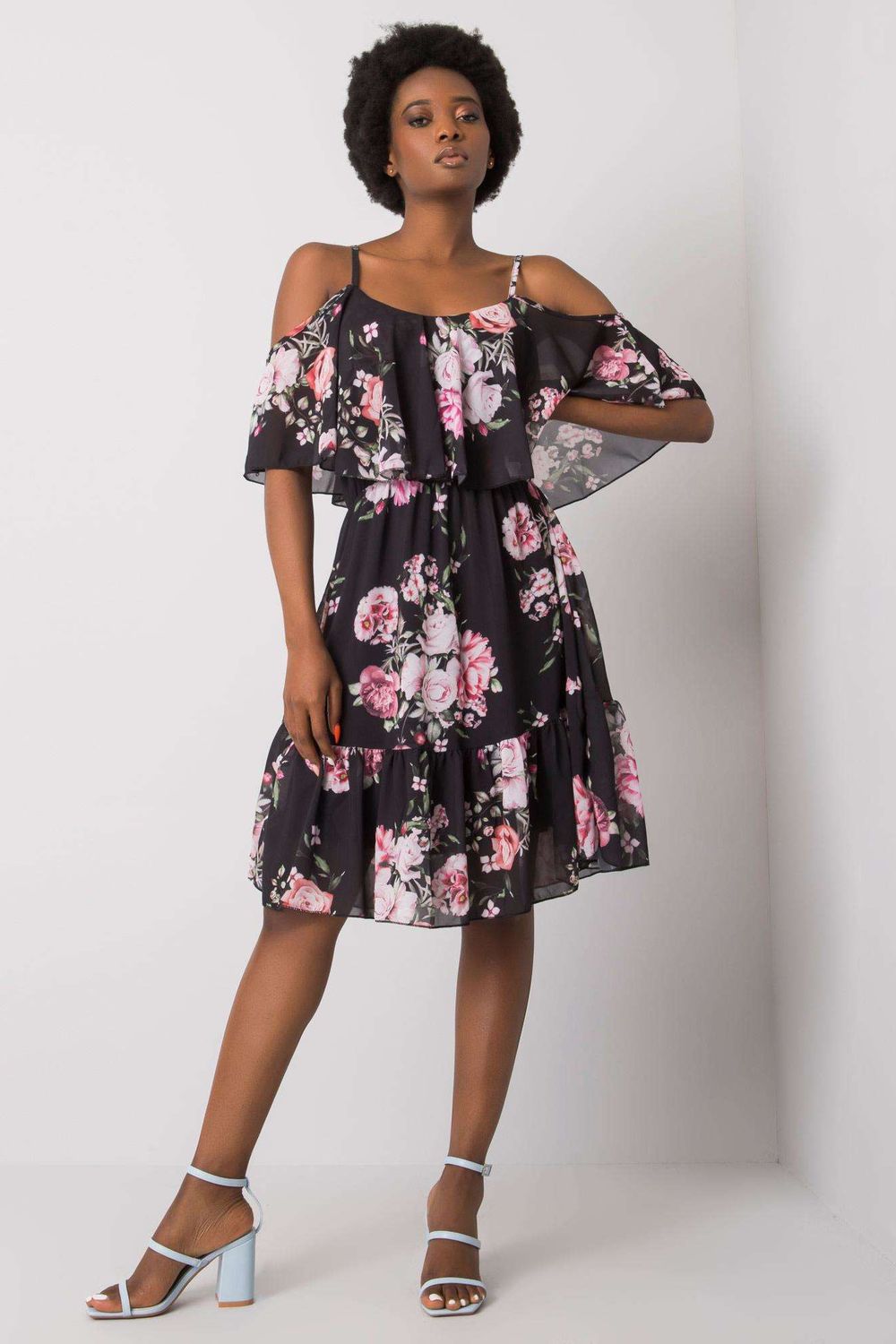 Jurk van gebloemde stof, op schouderbandjes met korte mouwen. Jurk in een uitlopende snit met een franje. Ideaal voor vele gelegenheden.