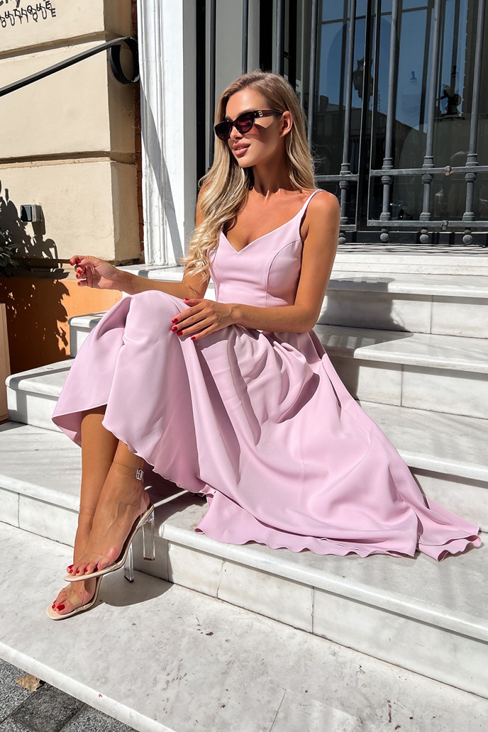 Strapless midi-jurk, licht uitlopend. De bovenkant van de creatie is op dunne bandjes, perfect passend in de taille. Schouders en rug bloot. Een model dat chic en vrouwelijkheid toevoegt. De jurk wordt gesloten met een bedekte ritssluiting en heeft een voering. Verkrijgbaar in verschillende kleuren.