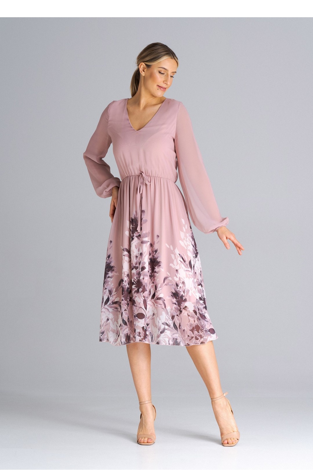 Uitlopende jurk met lange mouwen die eindigen in een elastische band. Een brutale halslijn, geplooid in de taille en over het hoofd gedragen.