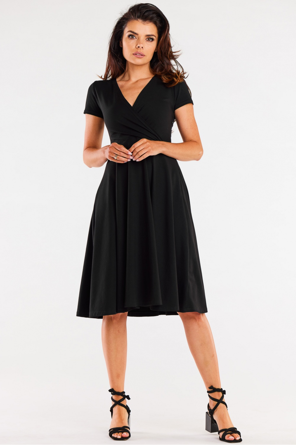 Midi-jurk met korte mouwen en een envelophalslijn. De jurk geeft het silhouet mooi vorm en benadrukt de pluspunten terwijl hij de zwakke punten verbergt. Ontworpen en genaaid in Polen.