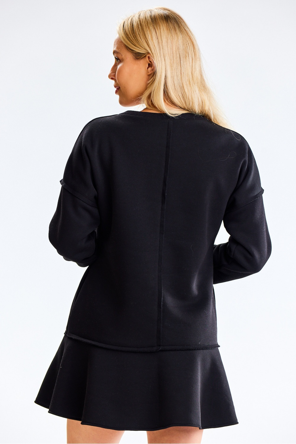 Jurk van dikke sweatstof met lange mouwen. Brede ruches onderaan, steekzakken in de zijnaden. Ontworpen en genaaid in Polen.