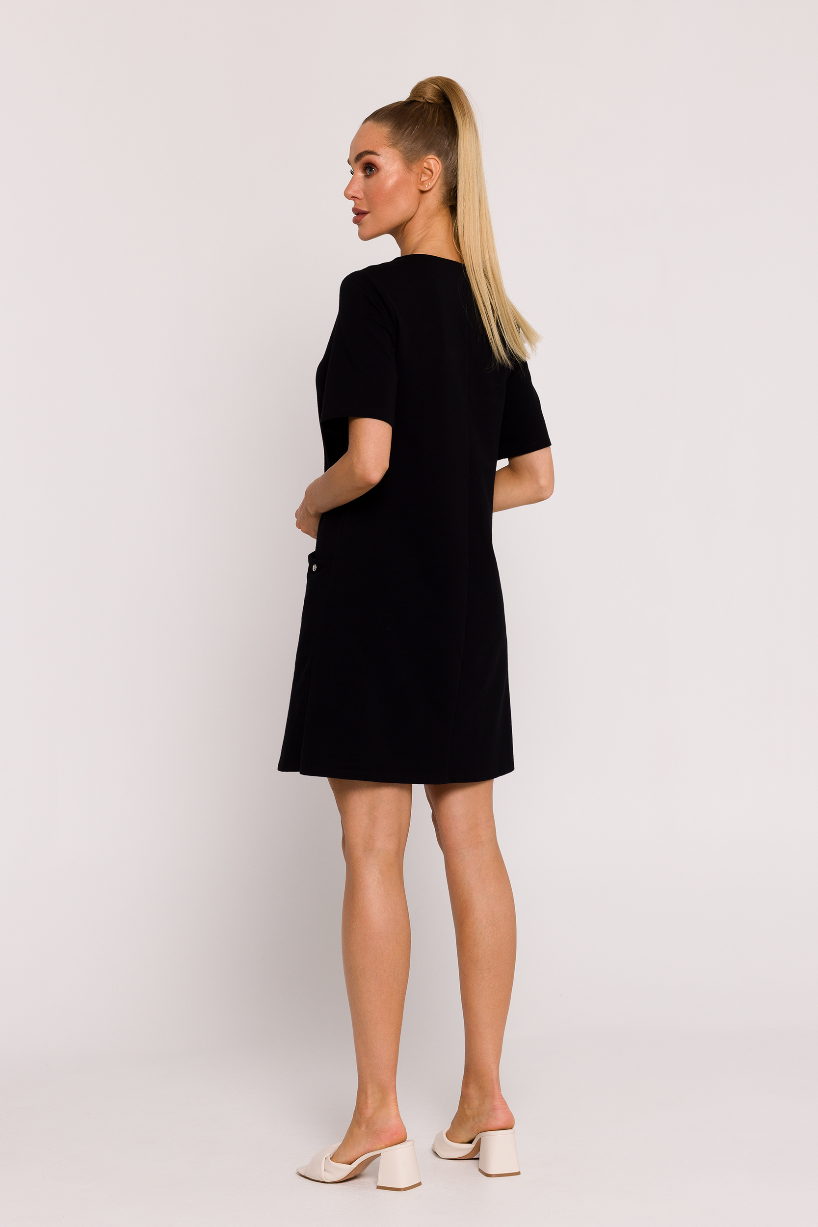 Deze gebreide jurk is een uniek product, ontworpen en gemaakt met aandacht voor detail in Polen, en benadrukt de hoge kwaliteit en stijl van Pools kleermakerswerk. De jurk heeft een A-lijn snit, waardoor hij licht aanvoelt en tegelijkertijd het vrouwelijke silhouet accentueert. Een subtiele halsuitsnijding voegt delicatesse toe aan de jurk en creëert een harmonieuze balans tussen elegantie en alledaags comfort. De korte mouwen maken de jurk ideaal voor warmere dagen en zorgen voor een luchtige look. De praktische steekzakken verborgen in de naden aan de voorkant van de jurk zijn niet alleen functioneel, maar voegen ook nonchalance en een urban touch toe. Het decoratieve logoplaatje op een van de zakken is een elegant decoratief element dat het unieke karakter van de jurk benadrukt. Opmerkelijk is dat de jurk geen voering heeft, waardoor hij licht en luchtig is, perfect voor zomerse dagen. Dit kledingstuk benadrukt niet alleen de Poolse ontwerp- en kleermakerstraditie, maar combineert ook functionaliteit, comfort en modieuze stijl. Deze jurk is een uitstekende keuze voor vrouwen die op zoek zijn naar een uniek kledingstuk, perfect voor zowel alledaags gebruik als voor speciale gelegenheden.