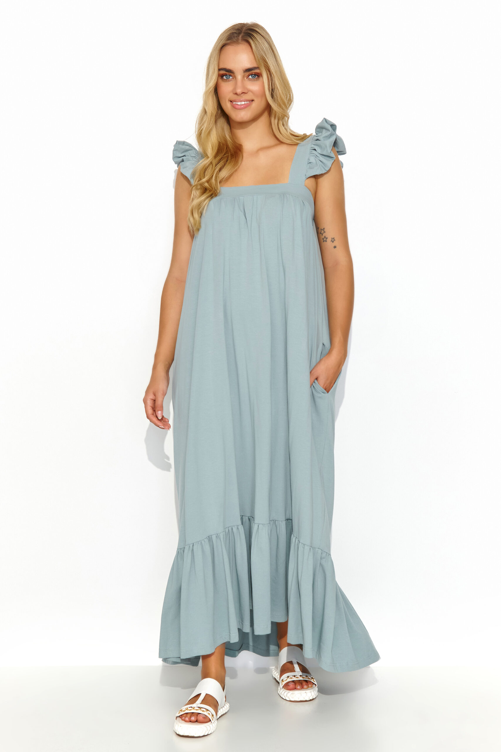 De maxi-jurk met ruches op de schouderbandjes en onderaan de creatie is de kwintessens van zomerse stijl en nonchalance. Dankzij de praktische steekzakken ziet de jurk er niet alleen stijlvol uit, maar is hij ook functioneel. De losse snit maakt hem uiterst comfortabel en geschikt voor verschillende gelegenheden. Het kan los gedragen worden, als je kiest voor luchtigheid en nonchalance, of vastgemaakt worden met een ceintuur om de taille te accentueren en de creatie een meer gedefinieerde vorm te geven. Hij is verkrijgbaar in verschillende kleuren, zodat je hem kunt aanpassen aan je stijl en stemming. Perfect voor een wandeling langs de pier of een romantisch diner bij zonsondergang. Met deze jurk zie je er niet alleen stijlvol uit, maar draag je hem ook comfortabel en licht, zodat je optimaal van je zomerse momenten kunt genieten.