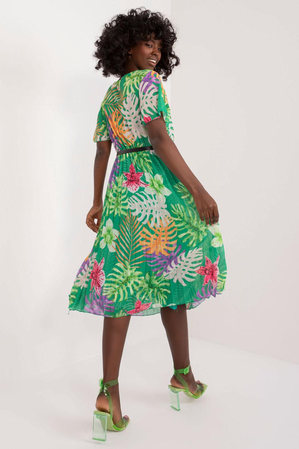 Deze jurk is een toonbeeld van alledaagse elegantie die elke dag bijzonder maakt. Het uitlopende model biedt bewegingsvrijheid en accentueert het vrouwelijke silhouet. Het onderste gedeelte van de jurk is versierd met plooien die lichtheid en delicatesse toevoegen aan de hele look. Deze jurk is gemaakt van polyester en ziet er niet alleen geweldig uit, maar is ook gemakkelijk te onderhouden en aangenaam om te dragen. De midilengte maakt hem geschikt voor vele gelegenheden, van wandelingen door de stad tot ontmoetingen met vrienden. De korte mouwen maken het comfortabel om te dragen, zelfs op warmere dagen, terwijl de envelophalslijn subtiele charme en een vrouwelijk tintje aan de jurk toevoegt. De jurk heeft een riem met gesp die de taille accentueert en proportie toevoegt aan het silhouet. Met een voering voor extra comfort is deze jurk een combinatie van stijl, comfort en elegantie waardoor je je elke dag zelfverzekerd en mooi voelt. Deze jurk is perfect voor alledaagse uitstapjes en zal snel een favoriet in je garderobe worden.