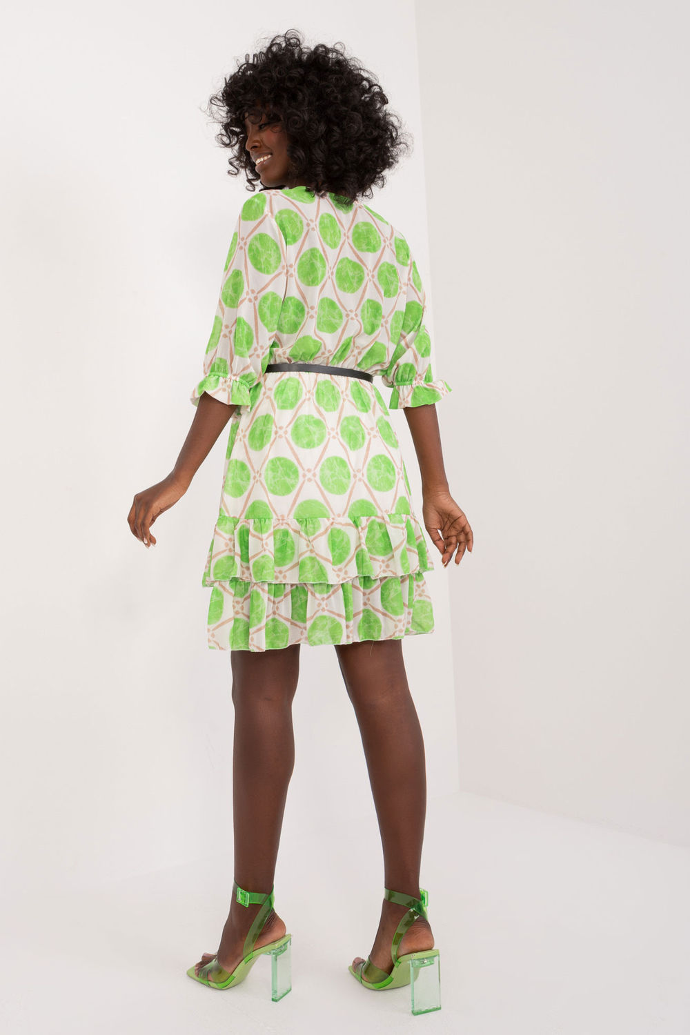 Dit schattige jurkje is de perfecte keuze om elke dag te dragen en voegt kleurrijke charme en plezier toe aan je outfit. De kleurrijke print geeft het een lichtgewicht en zomers gevoel, perfect voor warme dagen. De envelophalslijn geeft de jurk elegantie en subtiliteit, terwijl de halslijn zachtjes wordt benadrukt. De 3/4 mouw maakt het de perfecte keuze voor overgangsseizoenen en zorgt voor comfort en bewegingsvrijheid. De jurk is uitlopend, waardoor hij een lichte en meisjesachtige charme heeft en toch vrij kan bewegen. De minilengte is geschikt voor verschillende gelegenheden, van wandelingen door de stad tot ontmoetingen met vrienden. De jurk is voornamelijk gemaakt van polyester, is gemakkelijk schoon te maken en duurzaam, zodat je nog vele seizoenen van zijn charme kunt genieten. De jurk heeft ook een ceintuur die de taille accentueert en definitie toevoegt, en ruches aan de zoom die delicatesse en subtiliteit toevoegen. Bovendien heeft de jurk een voering voor een betere pasvorm en comfortabeler dragen. Met zijn zomerse karakter en meisjesachtige snit wordt deze jurk een onmisbaar onderdeel van je dagelijkse garderobe en voegt hij plezier en charme toe aan elke situatie.