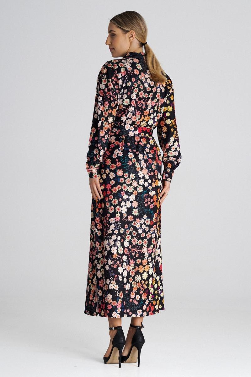 Maxi overhemdjurk met kraag. Decoratieve kleppen op borsthoogte. Lange mouwen afgewerkt met een manchet met knoopsluiting. De jurk sluit met knopen en is te strikken in de taille. Splitten aan de zijkanten. De jurk heeft geen zakken of voering.