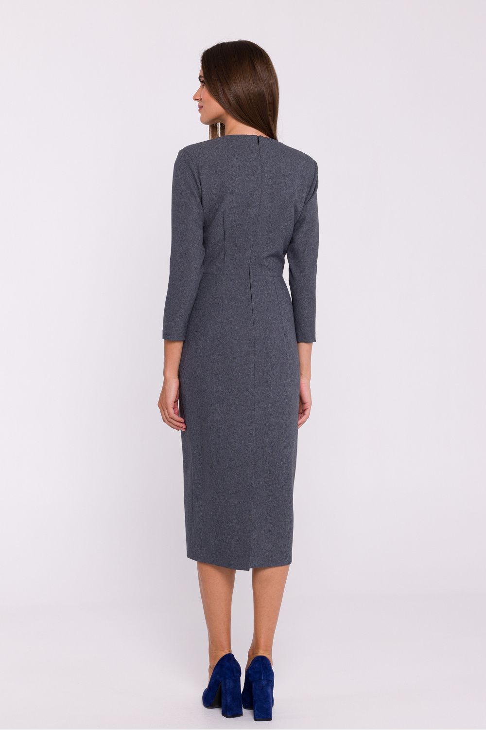 Elegante jurk van stof met een eenvoudige kokeruitsnijding, afgesneden in de taille, die het silhouet subtiel benadrukt. De V-halslijn voegt een chique touch toe en maakt de halslijn optisch slanker. De midilengte zorgt voor een klassieke look, ideaal voor zowel formele als casual gelegenheden. De jurk heeft een bedekte rits aan de zijkant en een voering voor comfort en een perfecte pasvorm. Een extra decoratieve touch is de aangehechte bloem op de borst, die bijdraagt aan de originaliteit. De jurk is ontworpen en genaaid in Polen en is de perfecte keuze voor vrouwen die van stijl en elegantie houden.