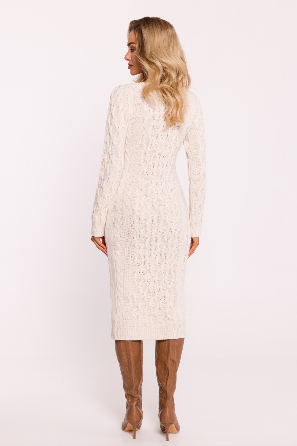 Een trui-jurk met een getailleerd model, gemaakt van garen met een bonte weving die het een unieke textuur en zachtheid geeft. De jurk heeft lange mouwen en een V-hals die de hals benadrukt en elegantie toevoegt. De midilengte biedt comfort en veelzijdigheid, ideaal voor verschillende gelegenheden. Het hele stuk is ontworpen en genaaid in Polen, wat garant staat voor hoogwaardig vakmanschap en aandacht voor detail.