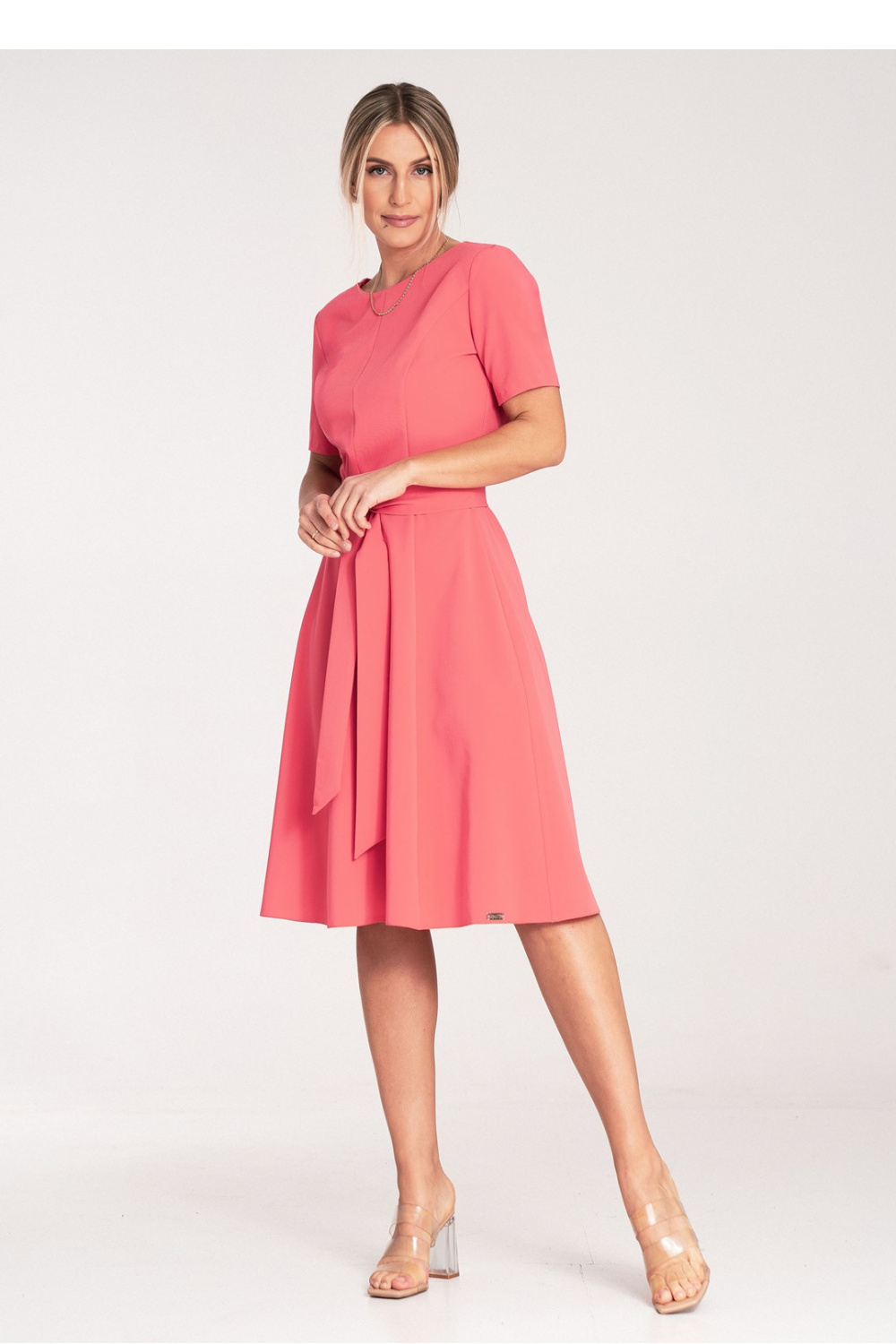 Klassieke midi-jurk in sleehak met korte mouwen. In de taille geknoopt met een stoffen ceintuur, blinde ritssluiting achter, boothals.