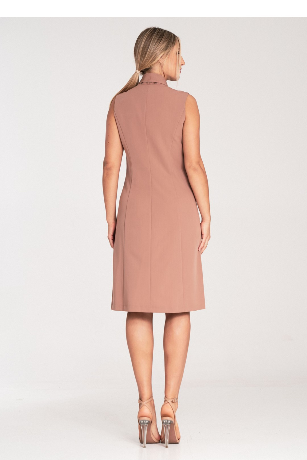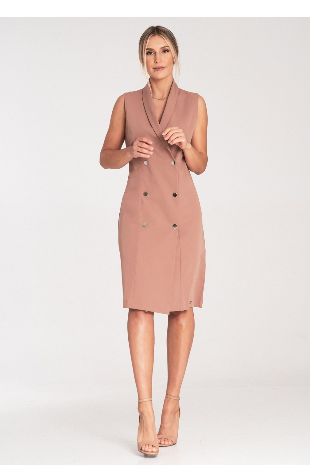 Elegante mouwloze midi-jurk. Met smalle revers aan de voorkant, enveloppe halslijn, double-breasted sluiting met grote decoratieve drukknopen. De jurk loopt iets uit aan de onderkant.