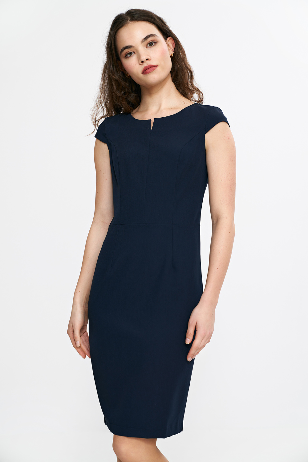 Elegante, aansluitende jurk met een klassieke fit. De ronde hals met subtiele split geeft het een verfijnd karakter. De korte kapmouw bedekt zachtjes de schouders en benadrukt het vrouwelijke silhouet. De potloodrok past mooi bij het figuur en de knielengte geeft het een tijdloze elegantie. De jurk sluit aan de achterkant in het midden met een praktische rits, wat zorgt voor comfortabel dragen en een perfecte pasvorm. Uitstekend voor speciale gelegenheden en elegante styling.