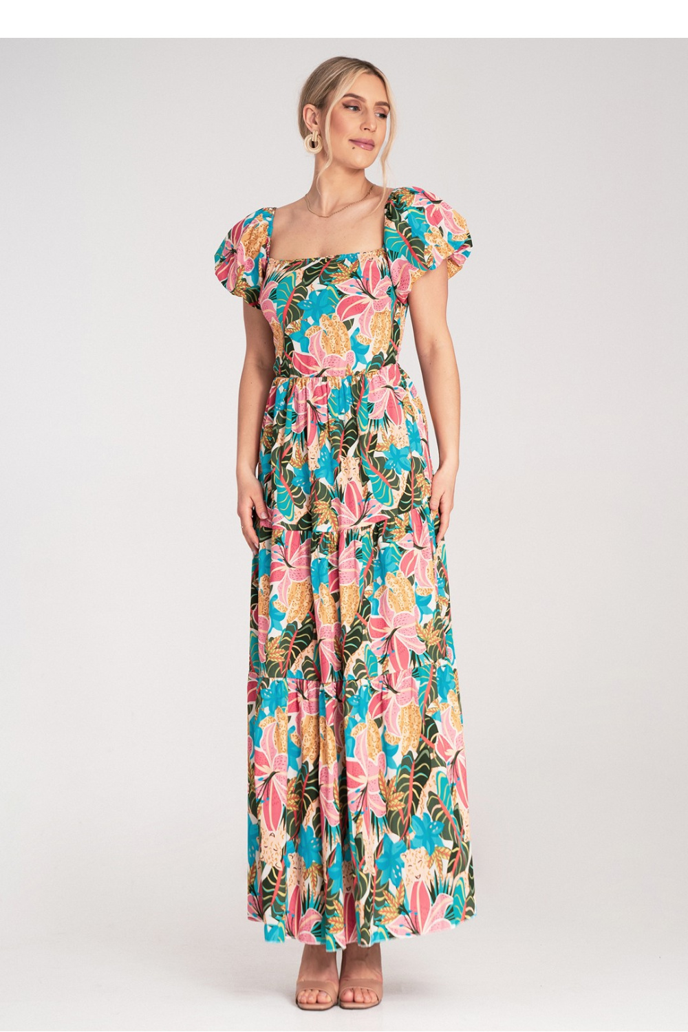 Maxi jurk met vierkante halslijn en korte, pofmouwen afgewerkt met elastiek. Bovenkant elastisch, met plooien aan de achterkant, passend bij de silhouet. Onderkant wijd uitlopend, genaaid van drie brede, geplooide niveaus.