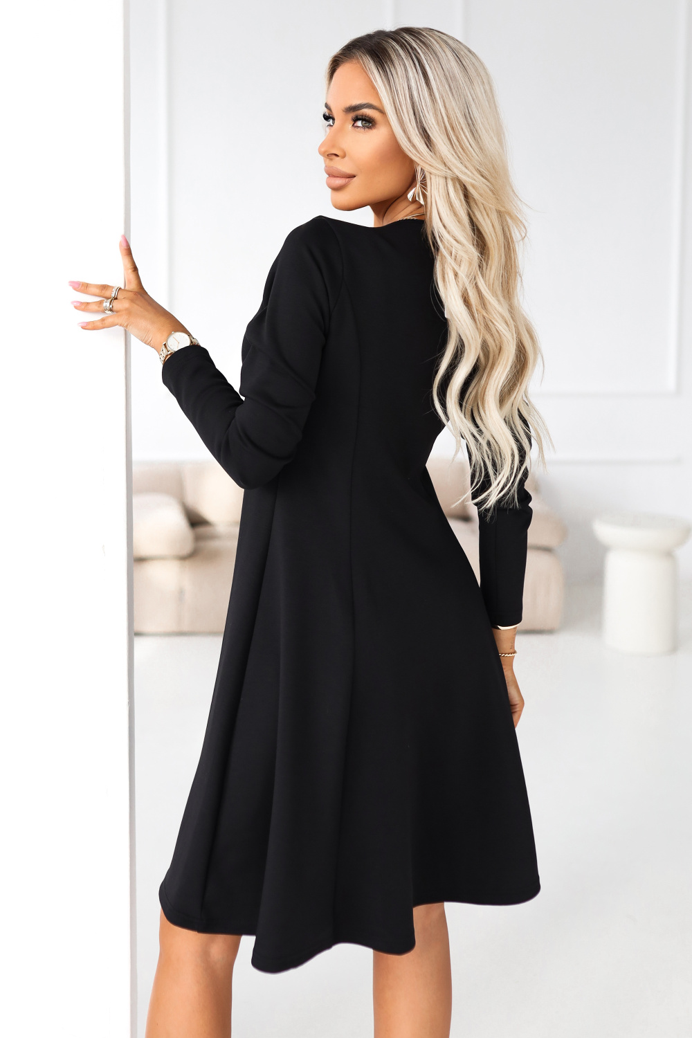 Ontdek de jurk die de definitie van eigentijdse elegantie is. Deze zwarte midi-jurk van het merk Numoco is een moderne interpretatie van de klassieke little black dress, gemaakt voor vrouwen die een onberispelijke stijl en de hoogste kwaliteit waarderen. Het geheim van dit model is de perfect doordachte constructie. De geometrische vierkante halslijn is een van de meest trendy trends van het seizoen – het verlengt prachtig de nek, accentueert de sleutelbeenderen en voegt een nobele uitstraling toe aan de styling. De top van de jurk past subtiel bij de silhouet, terwijl de uitlopende onderkant eventuele onvolkomenheden rond de heupen verdoezelt, waardoor het figuur perfecte zandloperverhoudingen krijgt. De lange, rechte mouw maakt dit een veelzijdige creatie die perfect is voor zowel koelere dagen op kantoor als avondjes uit. Door dit model te kiezen, ondersteun je de binnenlandse productie. De jurk is ontworpen en gemaakt in Polen door het gerenommeerde merk Numoco. Het hoogwaardige materiaal zorgt voor comfortabel dragen gedurende de hele dag, is bestand tegen kreukels en valt prachtig in beweging. Het is een universele basis voor je garderobe.