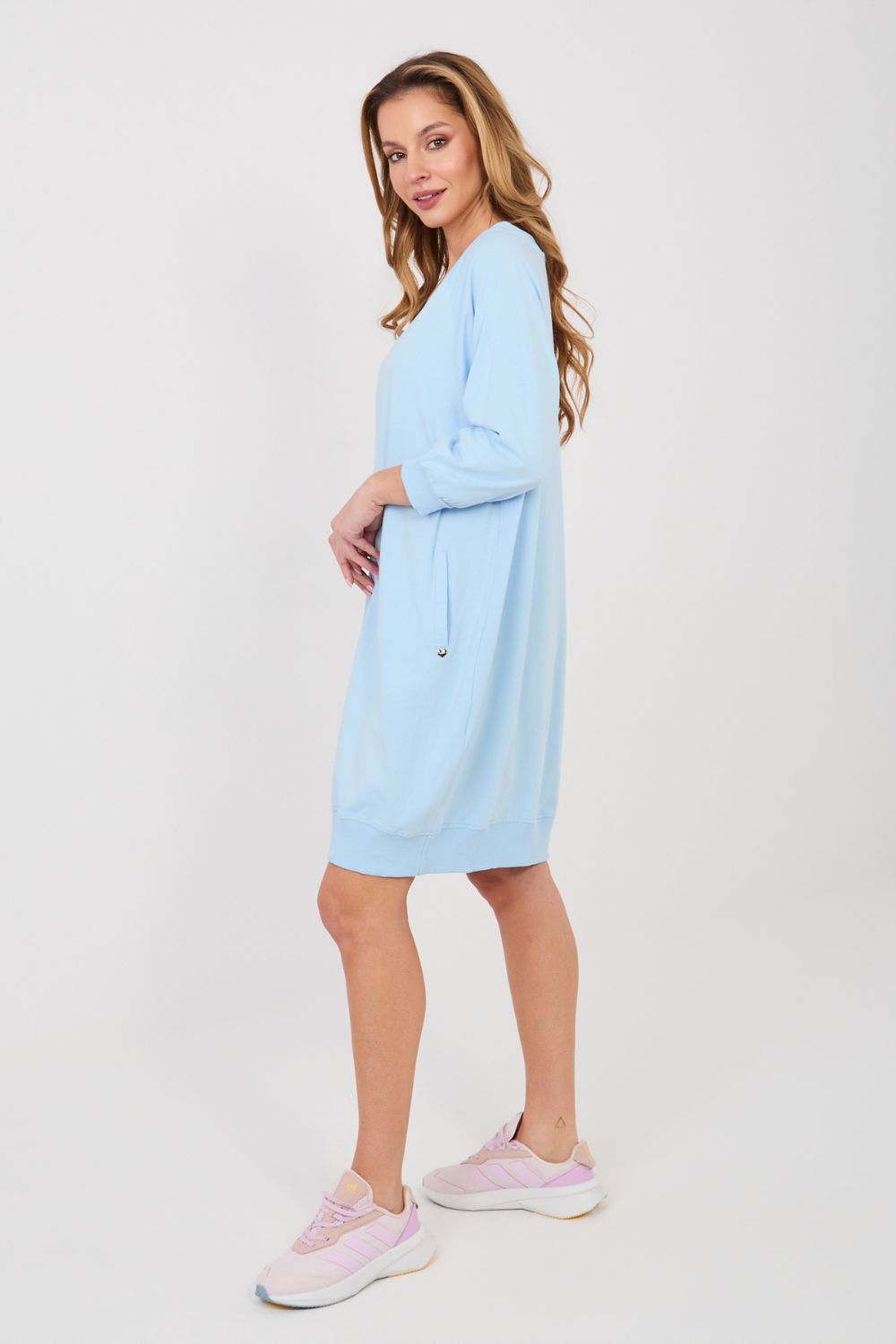 Comfortabele sweaterjurk met een eenvoudige snit is een uitstekend voorstel voor dagelijkse styling, die comfortabel dragen combineert met een casual stijl. Het gladde patroon geeft het een universeel karakter, waardoor het gemakkelijk te combineren is met verschillende accessoires. Het model tot net boven de knie, met praktische steekzakken, zorgt voor functionaliteit en bewegingsvrijheid. De 3/4 mouw zorgt ervoor dat de jurk het grootste deel van het jaar perfect is, en de vrouwelijke V-hals benadrukt subtiel de silhouet en voegt lichtheid toe. Het ontbreken van sluiting benadrukt de eenvoudige, comfortabele vorm van het model. De jurk is gemaakt van een hoogwaardige mix van katoen en elastaan, waardoor hij zacht, elastisch en aangenaam aanvoelt. Het is een ideale keuze voor vrouwen die comfort, praktische details en tijdloze stijl waarderen in het dagelijks leven.