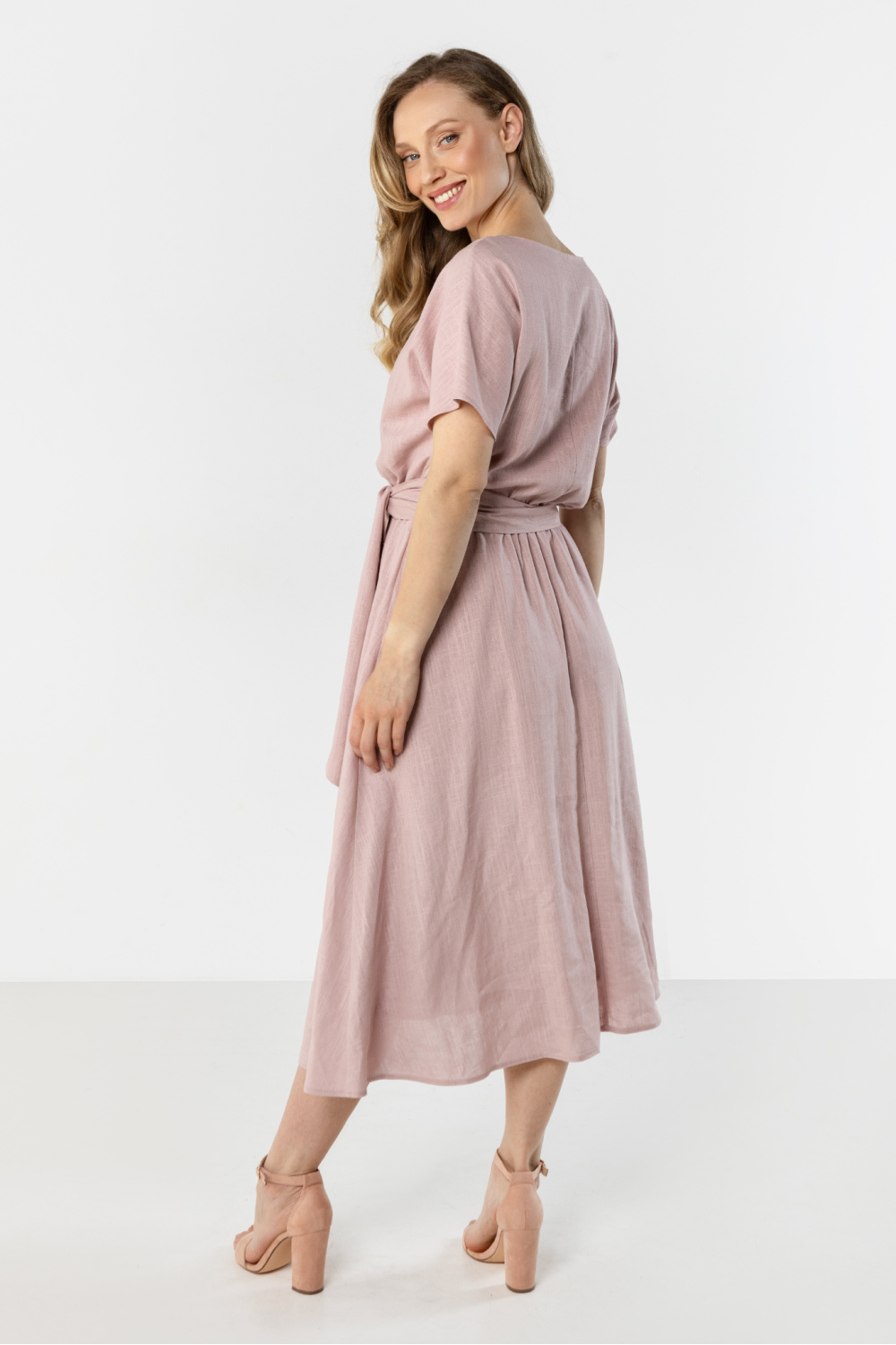 Lichte midi-jurk in een vrouwelijke, losse snit is een ideale keuze voor warme dagen. De eenvoudige halslijn benadrukt subtiel de neklijn, terwijl de korte mouwen zorgen voor comfortabel dragen. Het strikken in de taille modelleert prachtig de silhouet en voegt een elegant karakter toe, terwijl de wijd uitlopende onderkant zacht meebeweegt. De natuurlijke linnen stof zorgt ervoor dat het model luchtig is en zich perfect leent voor zowel dagelijks gebruik als zomerse uitjes.